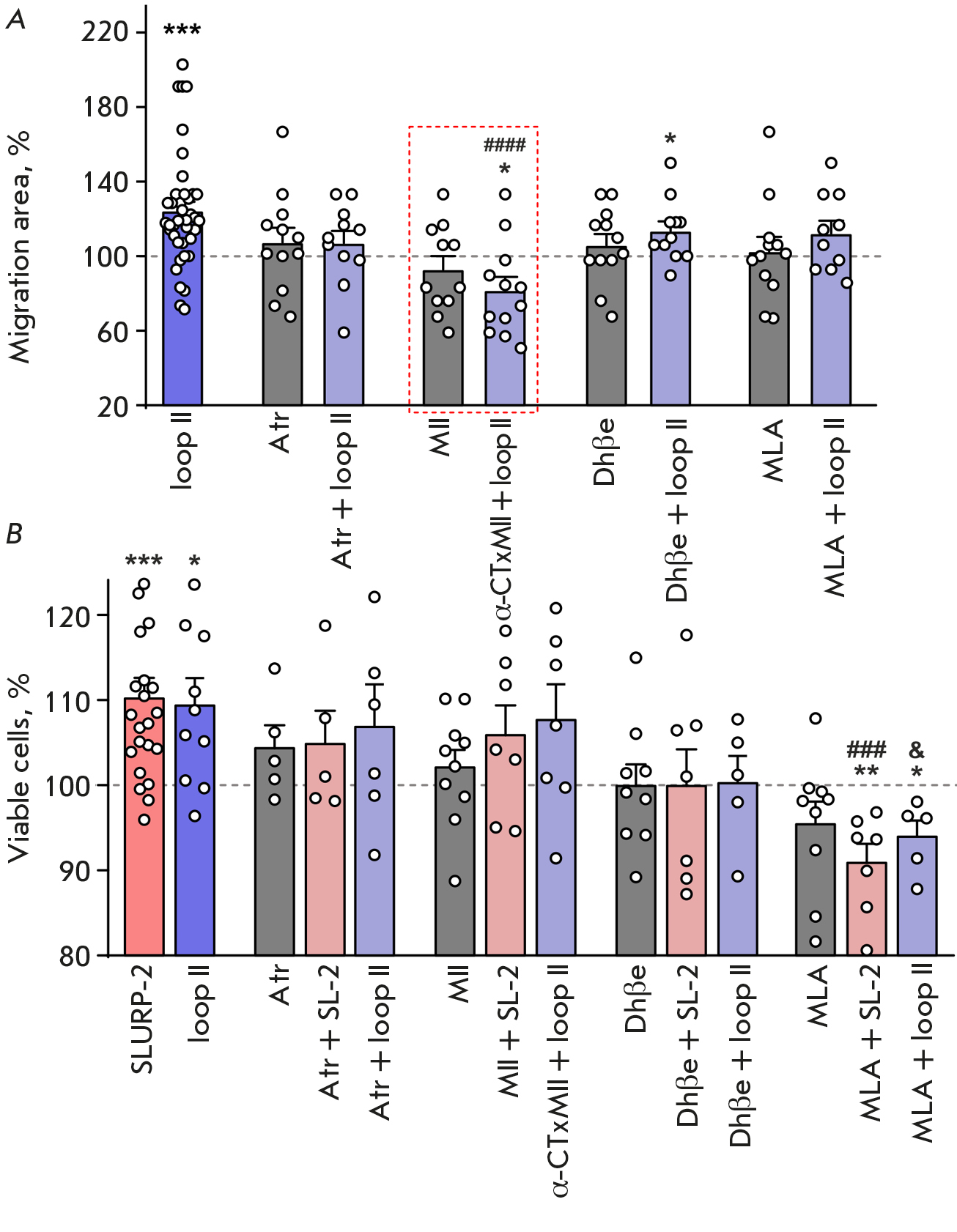 Fig. 3. The effects of SLURP-2, peptides, and inhibitors of different acetylcholine receptors on the viability and migration of HaCaT keratinocytes. (A) Effects of the loop II peptide (100 nm) and inhibitors of different acetylcholine receptors (1 μM) on the migration of HaCaT keratinocytes. Data are shown as a percentage of the control ± standard error of the mean (n = 11–40); 100% corresponds to the migration area of untreated cells. * p < 0.05 and *** p < 0.001 indicate a significant difference from the control (100%) according to the one-sample Student’s t-test. #### p < 0.001 indicates a difference from the loop II group according to the one-way ANOVA test, followed by the Dunnett’s/hoc test. (B) Effects of inhibitors of different acetylcholine receptors on the activity of SLURP-2 and the loop II peptide. Data are shown as a percentage of the control ± standard error of the mean (n = 4–14); 100% of viable cells corresponds to untreated cells. * p < 0.05, ** p < 0.01, and *** p < 0.001 indicate a significant difference from the control (100%) according to the one-sample Student’s t-test. ### p < 0.001 indicates a difference from the SLURP-2 group according to the one-way ANOVA test, followed by the Dunnett’s/hoc test; & p < 0.05 indicates a difference from the loop II group according to the one-way ANOVA test followed by the Dunnett’s/hoc test
