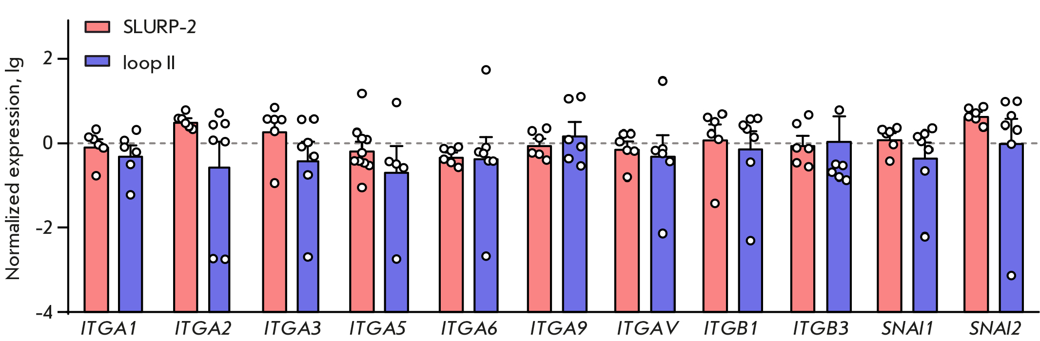 Fig. 4. The effects of 100 nM SLURP-2 and loop II peptide on the expression of mRNAs encoding α1, α2, α3, α5, α6, α9, β1, and β3 integrins and the SNAI1 and SNAI2 transcription factors. Data are normalized to the mean expression value in untreated cells and shown as lg ± standard error of the mean (n = 5–10). Gene expression is normalized to that of the housekeeping gene RPL13A