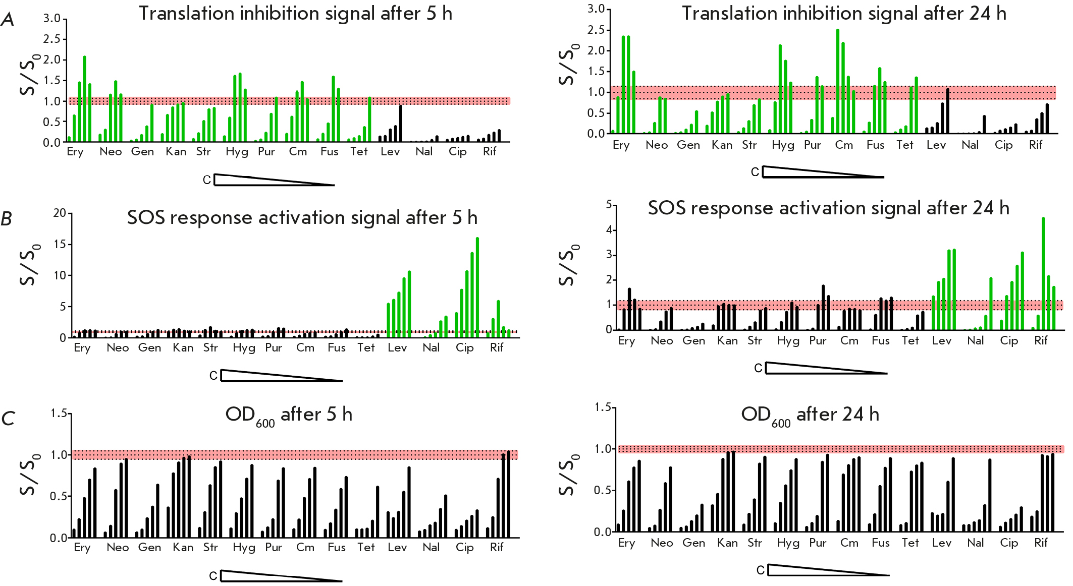 Fig. 1. Testing the double fluorescent protein reporter assay on known antibiotics. The vertical axis shows the S/S0 ratio, where S is the reporter fluorescent signal or OD600 detected in the presence of a sample; S0, without the sample. The horizontal axis shows the applied antibiotics; for each antibiotic, the concentrations (C) are arranged in descending order. Erythromycin (Ery) 10, 5, 2.5, 1.25, and 0.6 µg/mL; neomycin (Neo) 20, 10, 5, 2.5, and 1.25 µg/mL; gentamicin (Gen) 20, 10, 5, 2.5, and 1.25 µg/mL; kanamycin (Kan) 30, 15, 7.5, 3.8, and 1.9 µg/mL; streptomycin (Str) 12.5, 6.3, 3.1, 1.6, and 0.8 µg/mL; hygromycin B (Hyg) 100, 50, 25, 12.5, and 6.3 µg/L; puromycin (Pur) 15, 7.5, 3.8, 1.9, and 0.9 µg/mL; chloramphenicol (Cm) 0.7, 0.35, 0.18, 0.09, and 0.04 µg/mL; fusidic acid (Fus) 10, 5, 2.5, 1.25, and 0.6 µg/mL; tetracycline (Tet) 1.2, 0.6, 0.3, 0.15, and 0.075 µg/mL; levofloxacin (Lev) 0.1, 0.05, 0.025, 0.013, and 0.006 µg/mL; nalidixic acid (Nal) 100, 50, 25, 12.5, 6.3, and 3.1 µg/mL; ciprofloxacin (Cip) 1, 0.5, 0.25, 0.13, and 0.06 µg/mL; rifampicin (Rif) 25, 12.5, 6.3, 3.1, and 1.6 µg/mL. The red area indicates the range of background values.