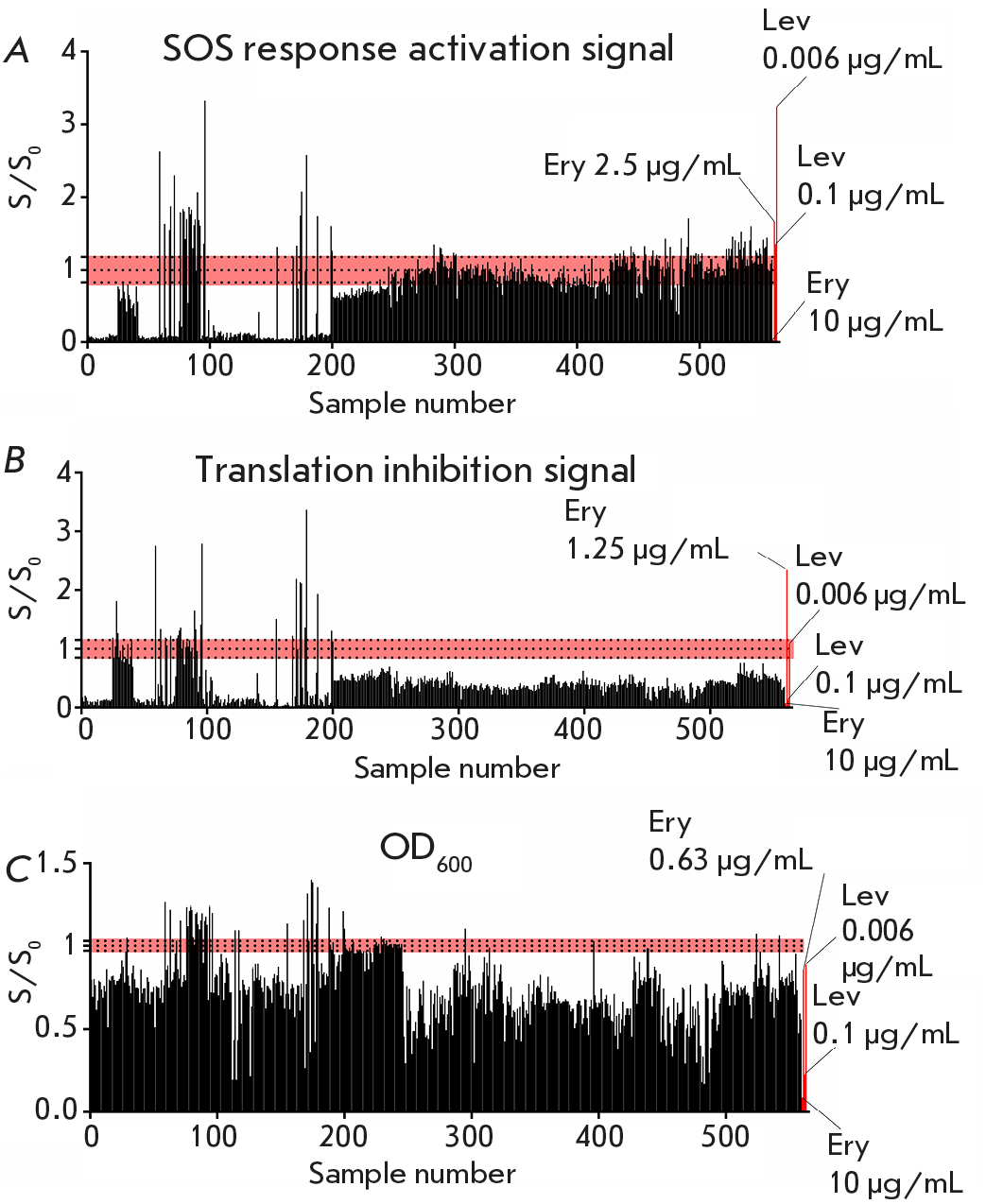 Fig. 2. Application of the double fluorescent protein reporter assay on the Sakhalin yeast collection. The vertical axis shows the S/S0 ratio, where S is the reporter fluorescent signal or OD600 induced in the presence of a sample; S0 is the reporter fluorescent signal or OD600 induced without a sample after 24 h. The horizontal axis shows sample number. Data for erythromycin (Ery) (10, 2.5, 1.25, 0.6 µg/mL) and levofloxacin (Lev) (0.1, 0.006 µg/mL) are used as positive controls. The red area indicates the range of background values. (A) The SOS response activation reporter signal. (B) Translation inhibition reporter signal. (C) The OD600 values