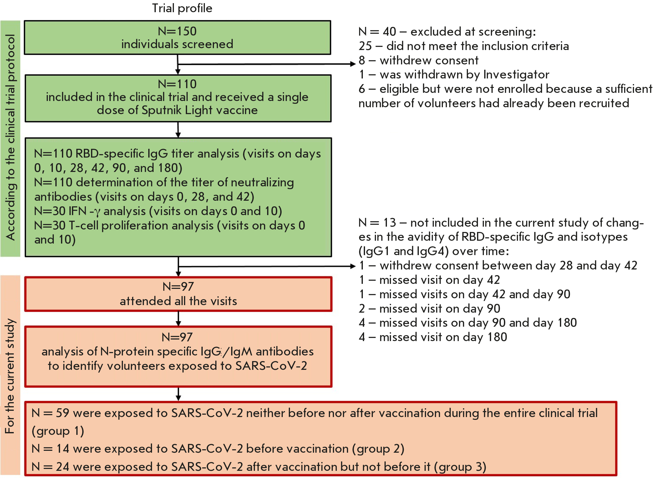 As a result of the screening, 110 out of 150 volunteers were enrolled in the study without prior randomization and stratification. All clinical trial participants met the following inclusion criteria: the volunteers had signed an informed consent to participate in the study; aged more than 18 years; had no chronic infectious diseases (HIV, hepatitis B and C, syphilis) or cancer; had not been vaccinated against COVID-19 with any other medicinal products; had received no therapy with immunoglobulins or immunosuppressants within 30 days prior to enrollment; had no COVID-19 as confirmed by the negative PCR SARS-CoV-2 RNA test result at screening (Intifica Alkor Bio kit, Russia) and the negative result of semi-quantitative enzyme immunoassay for IgM and IgG antibodies against SARS-CoV-2 (Mindray kit, China); and had no past history of COVID-19.