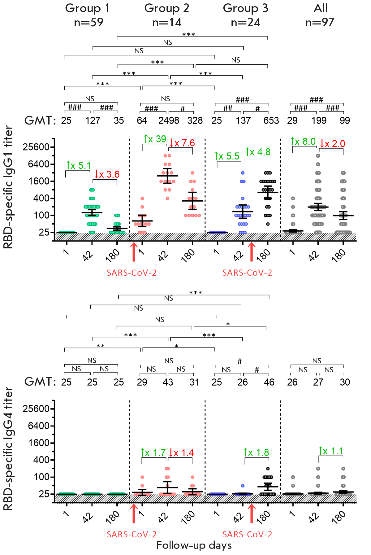 Fig. 3. Titer of RBD-specific IgG1 and IgG4 antibodies in volunteers vaccinated with Sputnik Light. The data before (day 1) and on days 42 and 180 after vaccination for all the participants (gray dots), as well as ones stratified depending on the presence/absence SARS-CoV-2 infection: group 1 – individuals not infected with SARS-CoV-2 (green dots); group 2 – individuals infected with SARS-CoV-2 before vaccination (red dots); and group 3 – individuals infected with SARS-CoV-2 after vaccination (blue dots). Black dots indicate participants infected with SARS-CoV-2 in group 3. N denotes the number of volunteers in each stratum. Dots show individual data points. Horizontal lines refer to the geometric mean titers (GMT); whiskers represent a 95% confidence interval (CI). The values are shown above the graph. The colored numbers with arrows above the square brackets indicate the fold increase or decrease in the GMT compared to the previous time point. The red arrows below the horizontal axis indicate the time of infection with the SARS-CoV-2 virus. Significant differences between different time points within the same group are indicated by hashes: # p < 0.05; ## p < 0.005; ### p < 0.0001 (calculated using the Friedman test with Dunn’s correction). Statistically significant intergroup differences are indicated by asterisks: * p < 0.05; ** p < 0.005 or *** p < 0.0001 (the Kruskal–Wallis test with Dunn’s correction). NS indicates non-significant difference