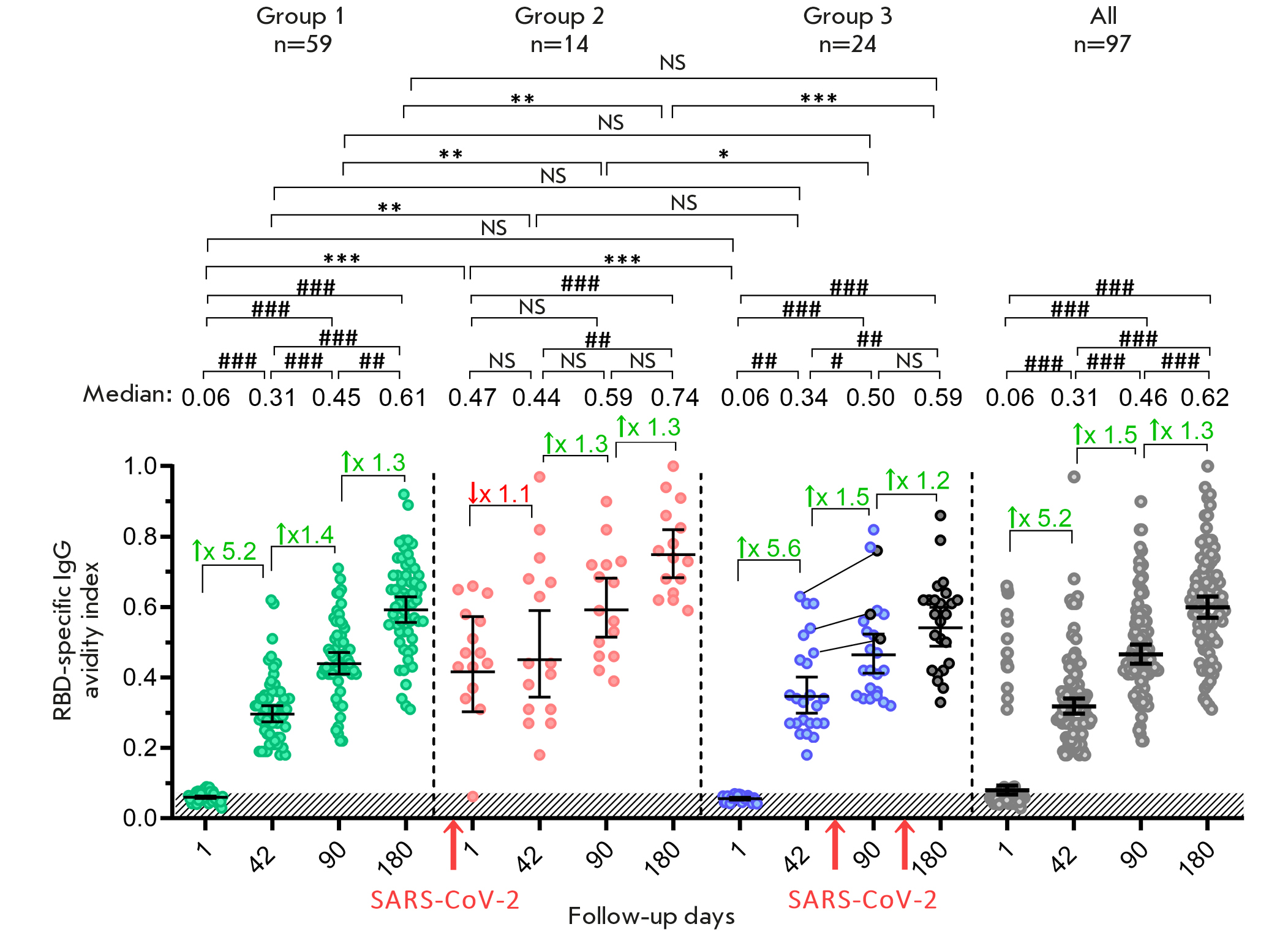 Fig. 4. The avidity index of RBD-specific IgG antibodies in volunteers vaccinated with Sputnik Light. Avidity indices are shown before (day 1) and on days 42, 90, and 180 after vaccination for all the participants (gray dots), as well as the ones stratified depending on the presence/absence of the SARS-CoV-2 infection: group 1 – individuals not -infected with SARS-CoV-2 (green dots); group 2 – individuals infected with SARS-CoV-2 before vaccination (red dots); and group 3 – individuals infected with SARS-CoV-2 after vaccination (blue dots). Black dots indicate participants infected with SARS-CoV-2 in group 3. The lines between the dots connect the values of the same participant before (day 42) and after infection (day 90). N denotes the number of participants in each stratum. Dots show individual data points. Horizontal lines represent the geometric mean titers (GMT); the values are shown as black numbers above the graph. Whiskers represent a 95% confidence interval (CI). The colored numbers and arrows above the square brackets indicate the fold increase or decrease in аvidity indices compared to the previous time point. The red arrows below the horizontal axis indicate the time of SARS-CoV-2 infection of the volunteers. Significant differences between different time points within the same group are indicated with hashes: # p < 0.05; ## p < 0.005; ### p < 0.0001 (Friedman test with Dunn’s correction). Significant intergroup differences between groups are indicated with asterisks: *p < 0.05; ** p < 0.005 or *** p < 0.0001 (Kruskal–Wallis test with Dunn’s correction). NS indicates non-significant difference