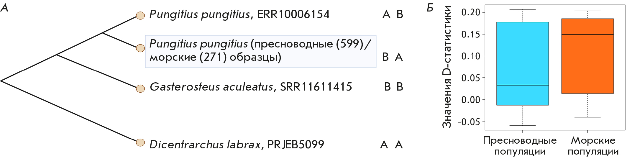 Рис. 1. ABBA-BABA-тест. А – схематическая интерпретация ABBA-BABA-теста для четырех таксонов, используемых для выявления интрогрессии между пресноводными и морскими популяциями девятииглой колюшки и трехиглой колюшки. AB – случайно выбранная пресноводная девятииглая колюшка из набора данных, полученного Фенгом и соавт. [17]. BA – особи морской и пресноводной девятииглой колюшки, изученные Фенгом и соавт. [17]. BB – геномные данные особи трехиглой колюшки, ранее опубликованные Недолужко и соавт. [16], AA – обыкновенный лаврак (Dicentrarchus labrax), внешняя группа. Б – распределение значений D-статистики среди пресноводных и морских особей девятииглой колюшки