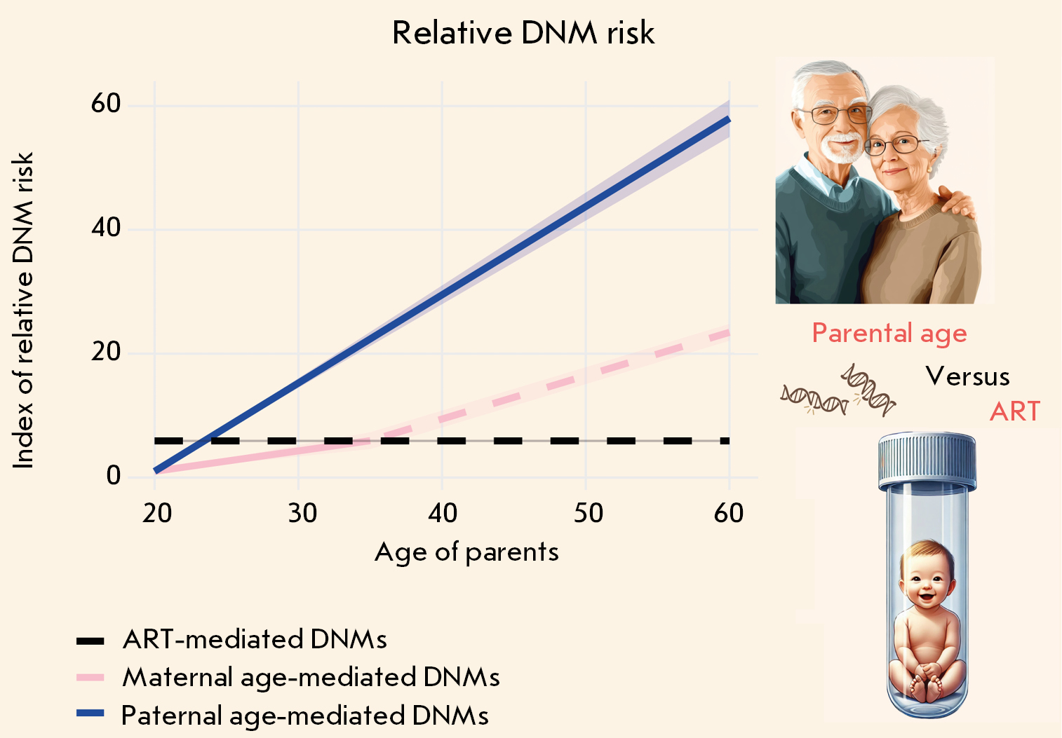 Fig. 2. The impact of parental age and ART on the relative risk of de novo mutations (DNMs). The X axis represents parental age, and the Y axis shows the index of relative risk for DNMs, normalized to the minimal risk level observed at age 20. An increase in the index indicates an elevated likelihood of de novo mutations. The shaded areas surrounding the lines represent the range of potential risks, which is influenced by the variability of the coefficients used in calculations. The dashed segment of the maternal DNMs line beyond age 35 indicates data revealing a pronounced acceleration in risk, although this increase remains unverified [56, 68].