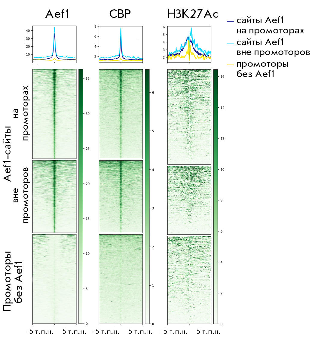 Мы заметили, что CBP и H3K27Ac также маркируют и сайты связывания Aef1, расположенные на промоторах, и проанализировали еще одну группу сайтов, а именно промоторы, которые не содержат белка Aef1 (рис. 2, нижние панели). Анализ таких сайтов выявил низкий уровень CBP и H3K27Ac. Таким образом, привлечение CBP и высокий уровень сигнала H3K27Ac на Aef1-содержащих промоторах коррелируют с наличием сайта связывания Aef1, а не с промотором как таковым.