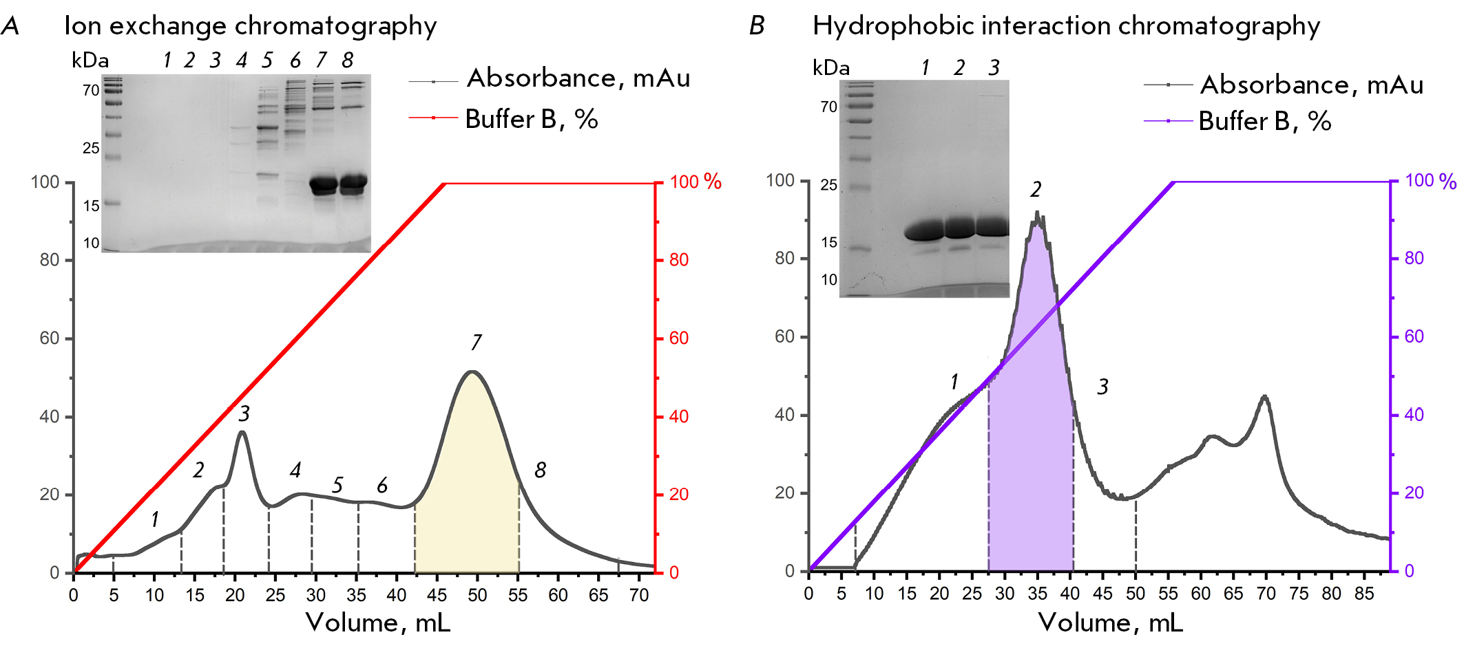 Fig. 1. (A) Ion exchange chromatography of samples after periplasmic lysis. The peak highlighted in color corresponds to the fraction containing the largest amount of α-synuclein. The inset at the top left-hand side shows the electrophoresis of protein fractions after ion exchange chromatography. (B) Hydrophobic interaction chromatography of samples after ion exchange chromatography. The peak highlighted in color corresponds to the fraction containing the highest amount of α-synuclein. The inset at the top left-hand side shows the electrophoresis of protein fractions after hydrophobic interaction chromatography. The molecular weight of the target protein is 19 kDa (apparent molecular weight). The peak number on the chromatographic profiles corresponds to the PAGE lane number
