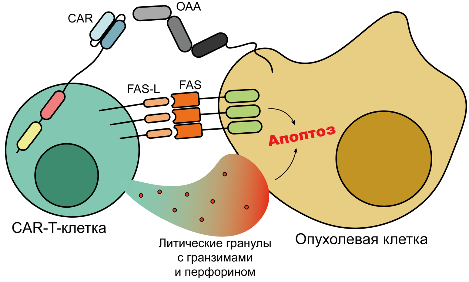 Fig. 1. The mechanistic basis of CAR T-cell therapy. The interaction between a CAR T-cell and a tumor cell is enabled by the specific recognition of a tumor-associated antigen (TAA) by the chimeric receptor. This leads to the activation of the cytotoxic functions of the CAR T-cell, mediated by the release of lytic granules containing granzymes and perforin, as well as by the interaction between the Fas ligand (FASL) and Fas receptor (FAS). Consequently, apoptosis of the tumor cell is induced