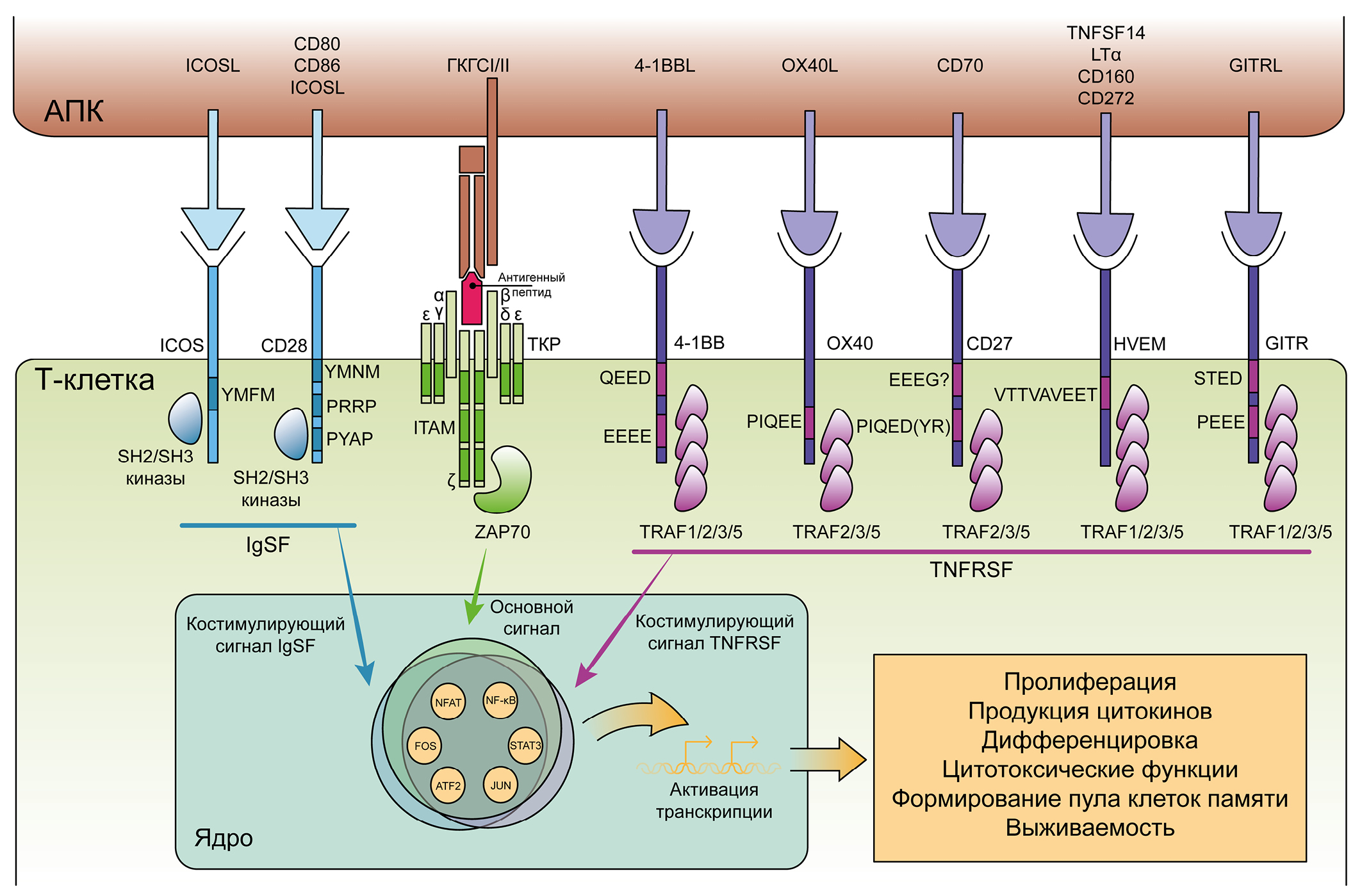 Fig. 3. Key superfamilies of T-cell costimulatory receptors. Presented is a general scheme of T-cell activation requiring both the primary and costimulatory signals, with the latter provided by TCR engagement with the major histocompatibility complex and by activating receptors from the IgSF and TNFRSF superfamilies binding their respective ligands. Amino acid sequences that are labeled in the receptors identify the primary signaling motifs. APC – an antigen-presenting cell; MHC I/II – major histocompatibility complex class I/II; IgSF – immunoglobulin superfamily; TNFRSF – tumor necrosis factor receptor superfamily; TNFSF – tumor necrosis factor superfamily; TCR – T-cell receptor; α, β – TCR recognition chains; ζ, γ, δ, ε – CD3 proteins of the TCR complex; ITAM – immunoreceptor tyrosine-based activation motif