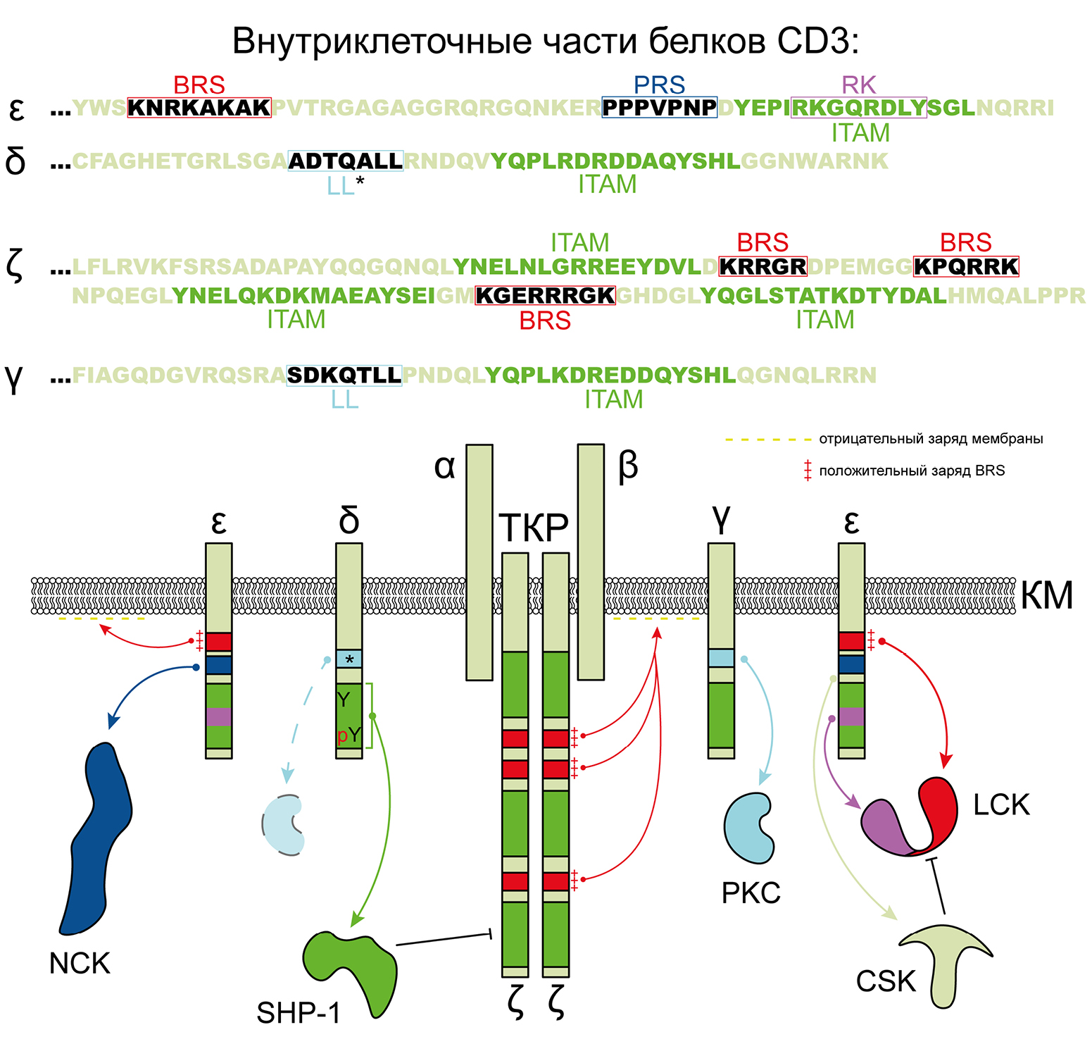 Fig. 4. Structure and functional features of CD3 group proteins. Shown is the arrangement of intracellular CD3ε, δ, ζ, and γ domains, each possessing specific motifs for interacting with intracellular signaling partners. ζ, γ, δ, and ε – the representative members of the CD3 T-cell receptor family; ITAM – an immunoreceptor tyrosine-activating motif; BRS – a basic amino acid-rich site; PRS – a proline-rich site; RK – a receptor kinase motif; LL – a serine-dependent dileucine motif (* indicates the absence of serine upstream of LL, which reduces the involvement of LL in T-cell receptor regulation); TCR – a T-cell receptor; α, β – recognizing chains of the T-cell receptor; CM – cell membrane; Y – tyrosine; and pY – phosphorylated tyrosine