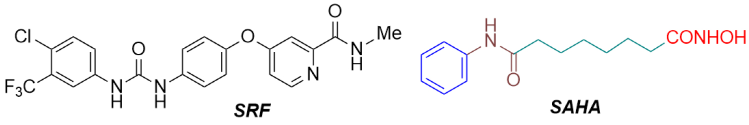 Fig. 1. The structures of sorafenib (SRF) and vorinostat (SAHA) with highlighted pharmacophore elements: cap (blue), connecting unit (CU, brown), linker (green), and zinc-binding group (ZBG, red)