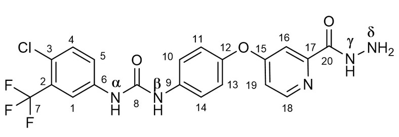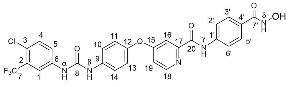 (E)-4-((2-(4-(4-(3-(4-chloro-3-(trifluoromethyl)phenyl)ureido)phenoxy)picolinoyl)hydrazinoylidene)methyl)-N-hydroxybenzamide (SRF-H-BHA). A solution of 85 mg (0.515 mmol) of 4-formyl-N-hydroxybenzamide [9] in 3.5 mL of MeOH–CH2Cl2, 5 : 2, and 30 μL of AcOHcat was added to a suspension of 233 mg (0.50 mmol) of SRF-H in 3 mL of a 2 : 1 MeOH–CH2Cl2 mixture, and the mixture was stirred for 5 min until the starting compound had dissolved. After 4 h, the resulting precipitate was filtered, washed successively on a filter with 10 mL of EtOH and 5 mL MeOH, and air-dried to yield 258 mg (84%) of SRF-H-BHA. 1H NMR (DMSO-d6): δ 12.23 (1H, s, NHγ), 11.27 (1H, s, NHd), 9.25 (1H, s, NHα), 9.08 (1H, s, OH), 9.04 (1H, s, NHb), 8.69 (1H, s, H1′), 8.60 (1H, d, J 5.6, H18), 8.13 (1H, d, J 2.2, H16), 7.84 (2H, d, J 8.4, H3′ and H7′), 7.71 (2H, d, J 8.4, H4′ and H6′), 7.71–7.59 (4H, m, H4, H10 and H14, H19), 7.50 (1H, d, J 2.5, H1), 7.25–7.18 (3H, m, H5, H11 and H13). 13C NMR (DMSO-d6): δ 166.56 (C15), 164.14 (C8′), 160.49 (C20), 152.96 (C8), 152.23 (C17), 151.04 (C18), 148.98 (C1′), 148.27 (C12), 139.80 (C9), 137.62 (C6), 137.23 (C2′), 134.46 (C5′), 132.48 (C4 or C5), 127.93 (C3′ and C7′), 127.47 (C4′ and C6′), 127.21 (q, J 30.7, C2), 123.63 (C4 or C5), 123.30 (q, J 273, C7), 122.86 (d, J 1.3, C3), 121.94 (C10 and C14), 121.05 (C11 and C13), 117.35 (q, J 5.7, C1), 115.16 (C19), 110.14 (C16). 19F NMR (DMSO-d6): δ ‒61.43 (CF3).