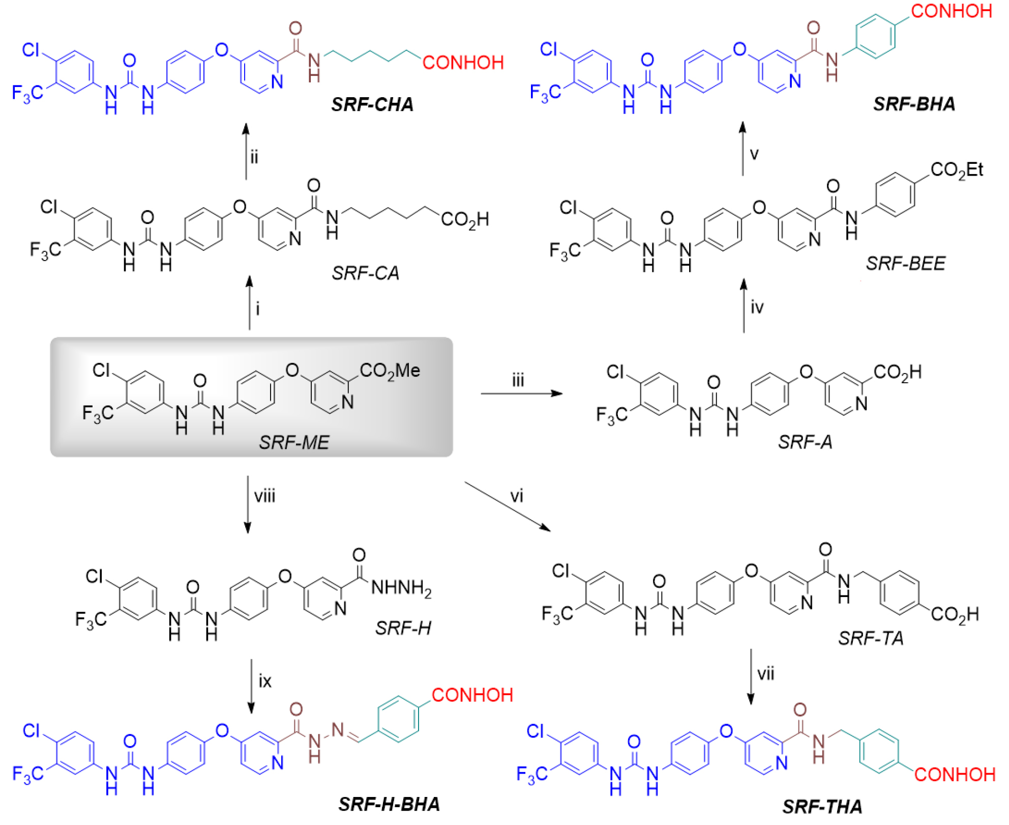 Fig. 2. The scheme for the synthesis of the hydroxamic derivatives of sorafenib: SRF-CHA, SRF-BHA, SRF-THA, and SRF-H-BHA: cap (blue), connecting unit (CU, brown), linker (green), and zinc-binding group (ZBG, red). Reagents, conditions, and yield (%): (i) NH2(CH2)5CO2H, DBU, MeOH, D, 6 h, (71%); (ii) CDI, DMF, 2 h, then NH2OH·HCl, 18 h, (70%); (iii) KOH, THF/MeOH/H2O, 1 h, (97%); (iv) p-NH2PhCO2Et, BOP-Cl, THF/Py, 3 h, (74%); (v) NH2OH, MeOH/THF, 0°C, 0.5 h, then 18 h, (71%); (vi) p-NH2CH2PhCO2H, DBU, MeOH, D, 14 h, (46%); (vii) CDI, DMF, 1.5 h, then NH2OH·HCl, 18 h, (44%); (viii) NH2NH2·H2O, MeOH/CH2Cl2, 2 h, (87%); (ix) p-(CHO)-PhCONHOH, AcOHcat, MeOH/CH2Cl2, 4 h, (84%)