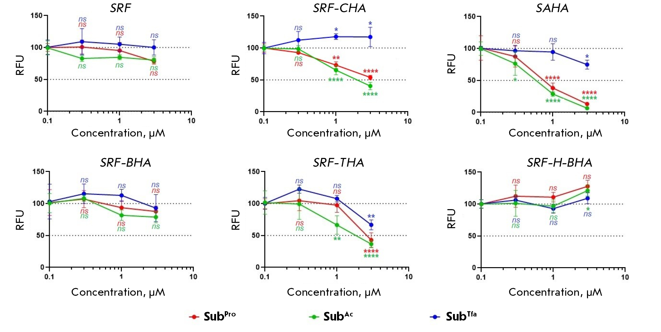 Fig. 4. The results of in-cell testing of the selectivity and potency of HDAC inhibition in the presence of sorafenib (SRF), hybrid inhibitors (SRF-CHA, SRF-BHA, SRF-THA, and SRF-H-BHA), and vorinostat (SAHA). Fluorogenic substrates of histone deacetylases: SubPro (HDACs class I), SubAc (HDACs class I and IIb), and SubTfa (HDACs class IIa); RFU is the relative fluorescence units. The statistical significance was calculated using the ANOVA test (GraphPad Prizm 8): ****p < 0.001, ***0.001 < p < 0.01, **0.01 < p < 0.05, *0.05 < p < 0.1, and ns – not significant