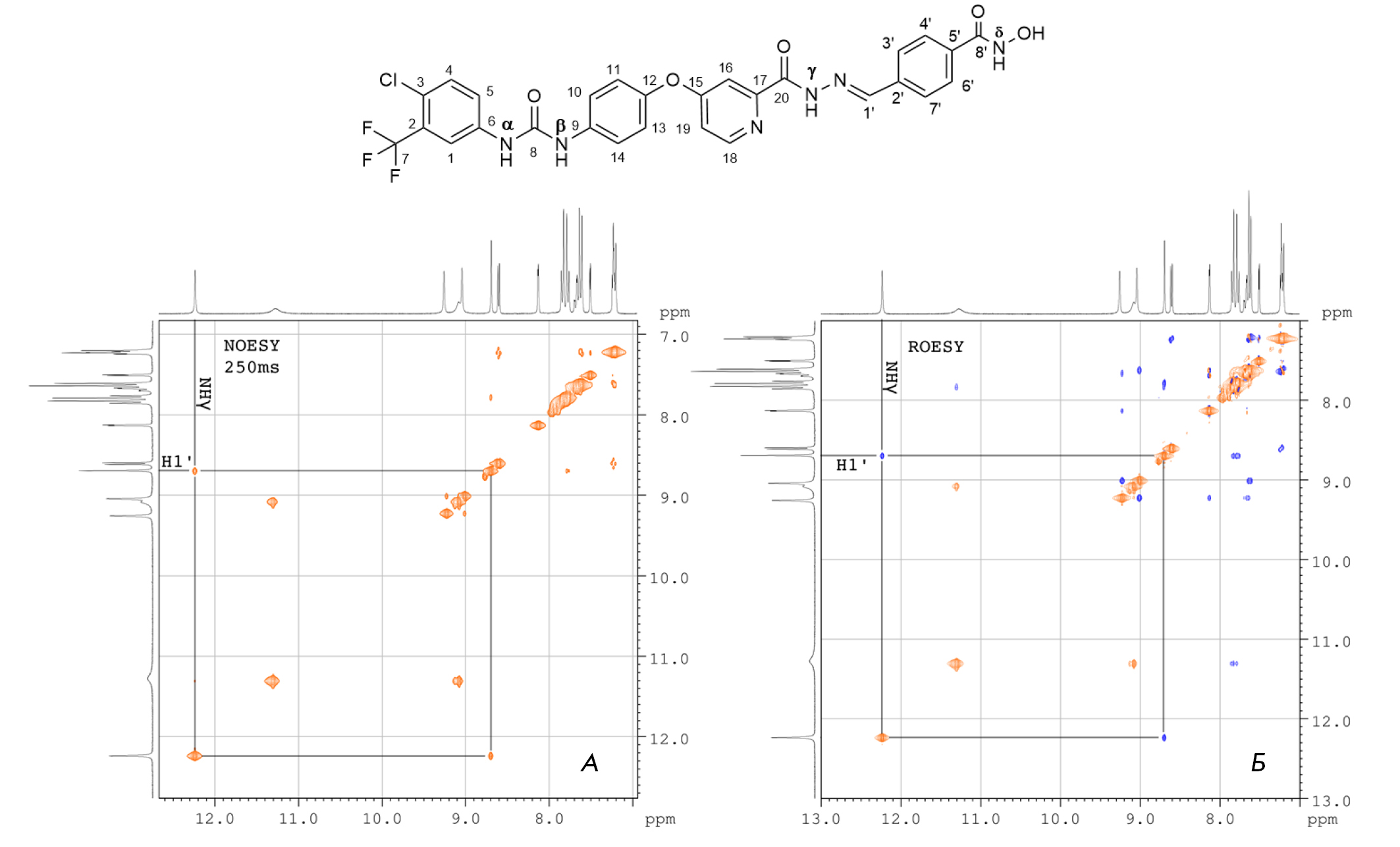 Fig. 3. The molecular structure of the (E)-isomer of SRF-H-BHA with atomic numbering as well as two-dimensional 1H spectra (A) NOESY at the mixing time of 0.25 s and (B) ROESY, 8 mg of SRF-H-BHA in DMSO-d6. Cross-peaks between the picolinoylhydrazone proton NHγ and proton H1′ at a double bond are shown. NOESY – Nuclear Overhauser Effect Spectroscopy, ROESY – Rotating frame Overhauser Effect Spectroscopy