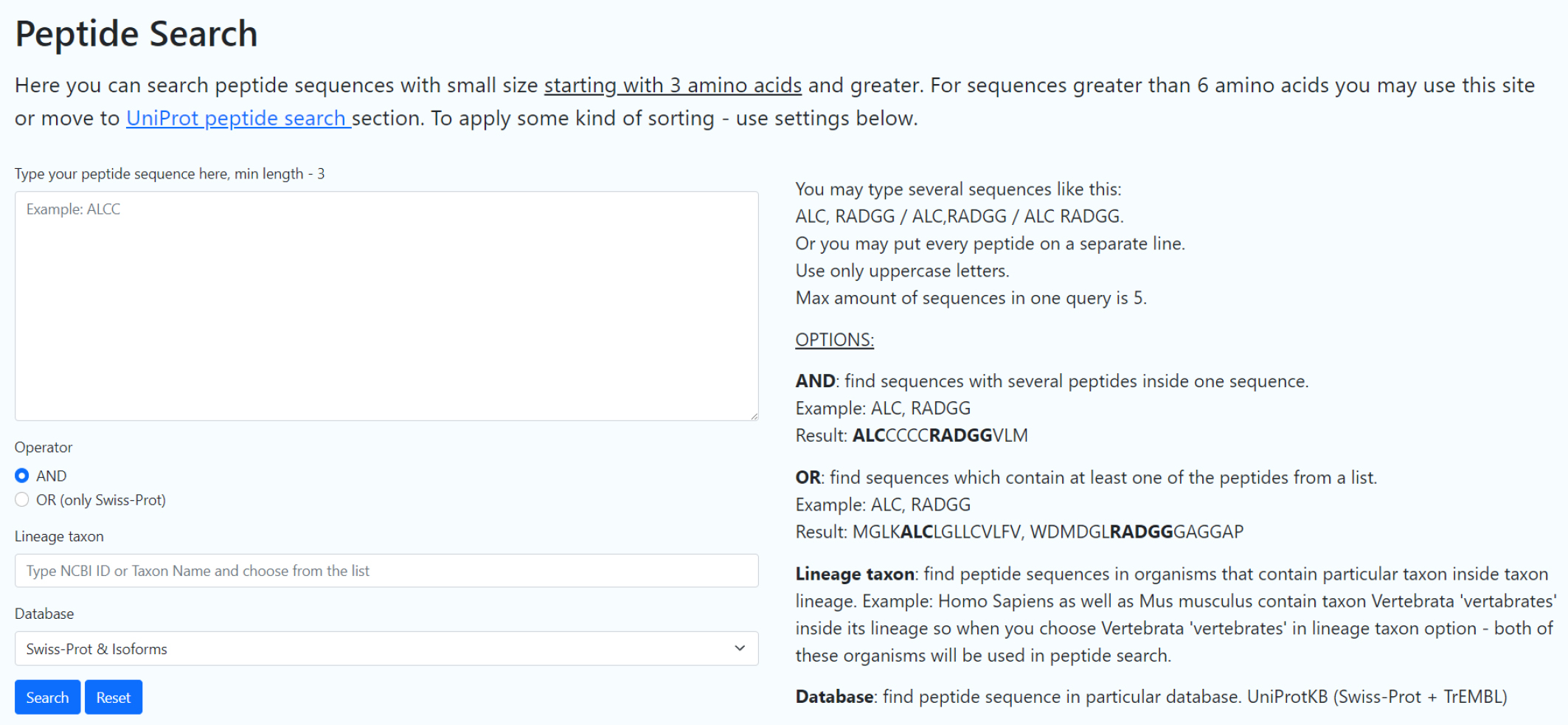 Сервер PepString (http://pepstring.eimb.ru) разработан на основе PostgreSQL-версии актуальных баз данных UniprotKB и SwissProt. Этот сервер позволяет пользователю искать точные совпадения коротких пептидов в белковых последовательностях. Запрос может быть ограничен определенным таксоном, например, Mammalia, Bacteria или Vertebrata, или всеми видами. Запрос также может быть основан на наличии нескольких фрагментов в одной последовательности (пять или менее фрагментов) или на наличии в последовательности хотя бы одного фрагмента из списка. Снимок начальной страницы показан на рис. 1. Несколько последовательностей могут быть введены с использованием запятой или/и пробела в качестве разделителя, например, «ALC,RADGG», «ALC, RADGG», «ALC RADGG». Каждую из нескольких последовательностей можно разместить на отдельной строке. Один запрос может содержать не более пяти последовательностей. Для поиска можно использовать два оператора: AND и OR. Оператор AND позволяет найти белковые последовательности, включающие все пептиды из запроса. Оператор OR позволяет найти белковые последовательности, включающие хотя бы один пептид из списка запроса. Поиск можно ограничить, выбрав таксон любого уровня, например Vertebrata или Archaea, или Mammalia, или Homo sapiens.