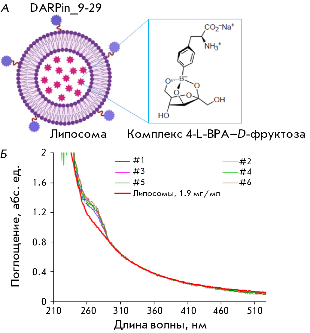 Fig. 1. DARPin-modified liposomes loaded with the 4-L-10BPA-D–fructose complex. (A) The schematic representation of DARP-Lip(BPA). The internal environment of liposomes is loaded with the 4-L-10BPA-D–fructose complex. The outer surface is modified by the HER2-specific scaffold protein DARPin_9-29. (B) The absorption spectra of DARPin-modified samples #1–6 containing 4-L-10BPA and the absorption spectrum of empty liposomes with a concentration of 1.9 mg/mL (red curve)