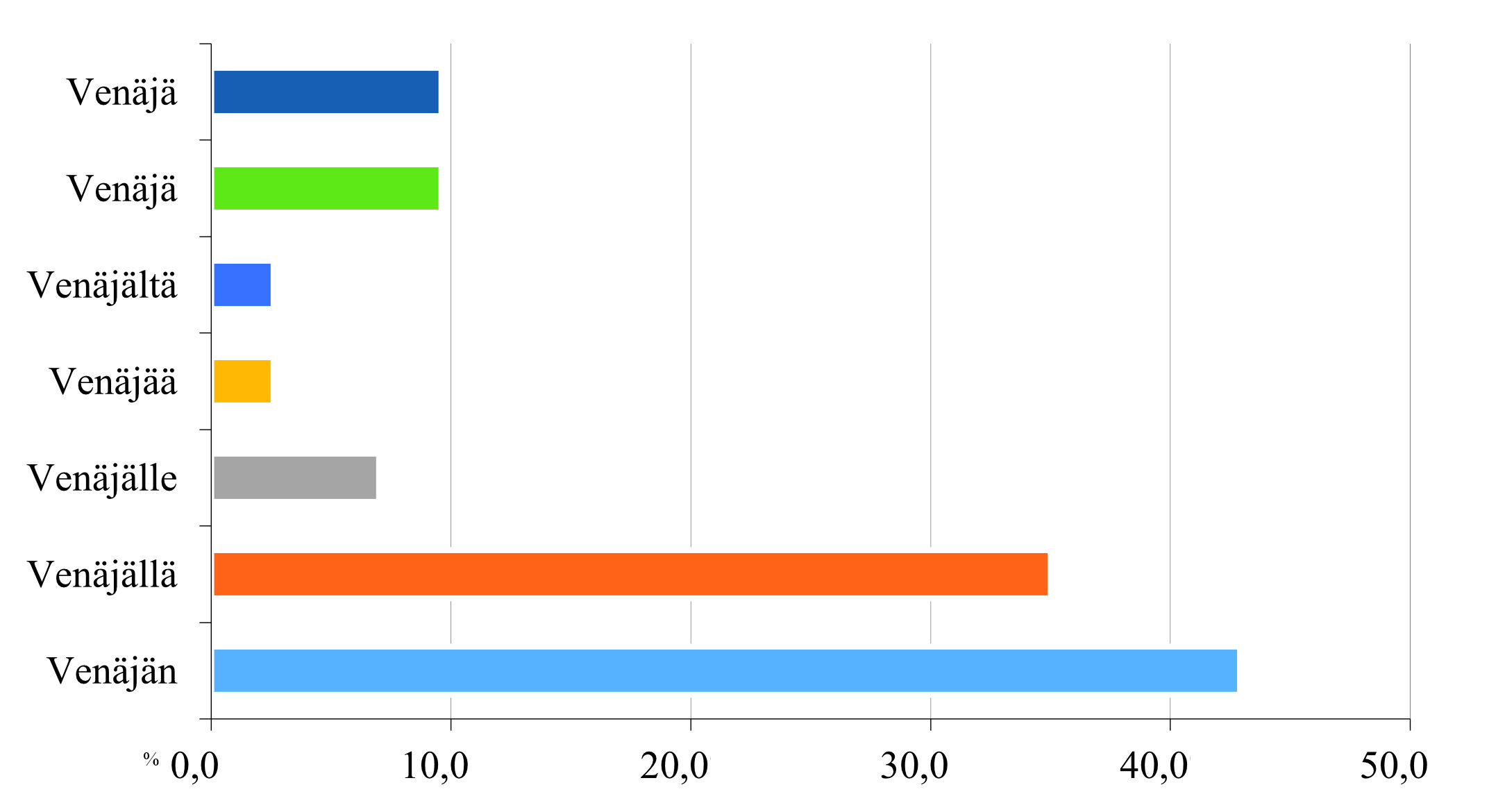 Подробнее проанализируем коллокации с единицей Venäjä. В первую очередь обращает на себя внимание распределение падежных форм. Наиболее частотными являются варианты Venäjän (генитивный оборот ‘России, русский, российский’) и Venäjällä (‘в России’) – 49 и 40 употреблений соответственно. Представим частотность словоформ в виде гистограммы (рис. 2).