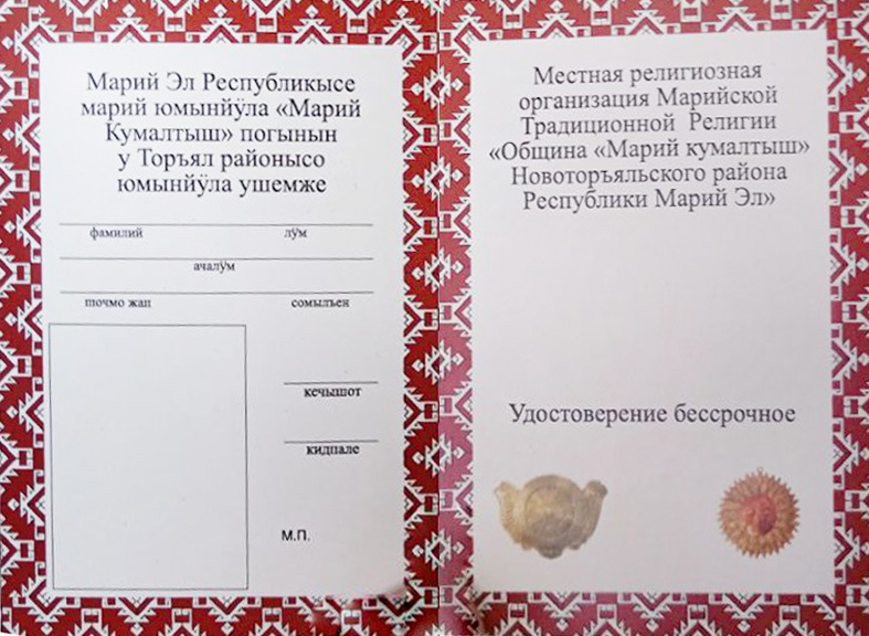 Факт того, что механизмы легитимации священнослужителей на юридическом уровне закреплены Уставом ЦРО МТР РМЭ, подтверждает введение удостоверения служителей культа мари местной религиозной организации Марийской Традиционной Религии, имеющего бессрочный характер (в соответствии со сложившейся традицией срока полномочий карта). А. И. Рукавишников при демонстрации бланка отмечает: «Это один из образцов удостоверения (рис. 1). Сейчас большинство общин удостоверение такого образца делает. Это удостоверение дается только карту. Пожалуй, это в какой-то степени документ, то есть статус юридический появляется потихоньку. То есть юридический статус поднимается. Есть определенные процедуры посвящения в служители культа»35. В удостоверении указываются: местная религиозная организация Марийской Традиционной Религии, Община «Марий кумалтыш» района, выдавшего документ, ФИО получателя, дата рождения, статус («ранг») служителя культа «сомылъеҥ» (в переводе с марийского – «жрец», букв. сомыл ‘дело’ + еҥ ‘человек’), дата вручения удостоверения «кечышот» и подпись «кидпале», указано место проставления печати.