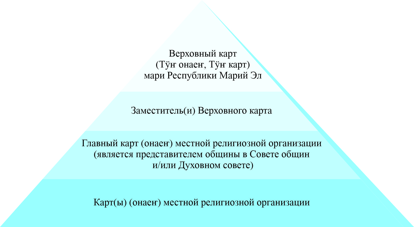 В настоящее время существует и административная структура в составе ЦРО МТР РМЭ – Совет старейшин, который включает в себя в качестве представителей священнослужителей из разных общин. В силу этого фактора вторая ступень иерархии, несмотря на ее неизменность, имеет определенное расширение, о чем свидетельствует служитель культа А. И. Рукавишников: «Все осталось так же. Главный карт – Районный главный карт – Глава общины (он может совмещать со статусом главного районного карта, как у меня в Куженере, в Сернуре также, в Мари-Туреке уже отдельно, в Параньге тоже отдельно) – карты»28. Подчеркнем, что в Уставе ЦРО МТР статусы «районный священнослужитель», «главный карт общины» не установлены, вместе с тем, согласно пункту 5.3, «священнослужителю ЦРО МТР может быть определен территориальный округ его ответственности за состояние духовной работы среди верующих»29.