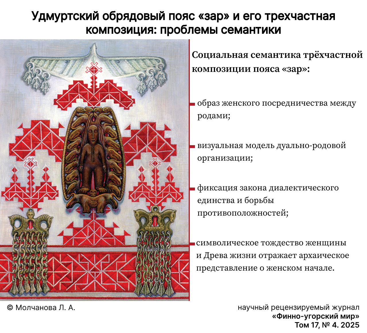 Conclusion. This article examines the ornamental scheme and narrative depicted in the three-part composition traditionally embroidered on the ritual belt known as a zar. The research will prove valuable to historians, ethnographers, art historians, and those with a general interest in folk art. The findings can be utilised in the preparation of general works on the history and theory of Finno-Ugric folk art, the development of specialised courses on Udmurt ethnography and traditional art within educational institutions, the creation of museum exhibitions, and the design of contemporary apparel featuring ethnic motifs.