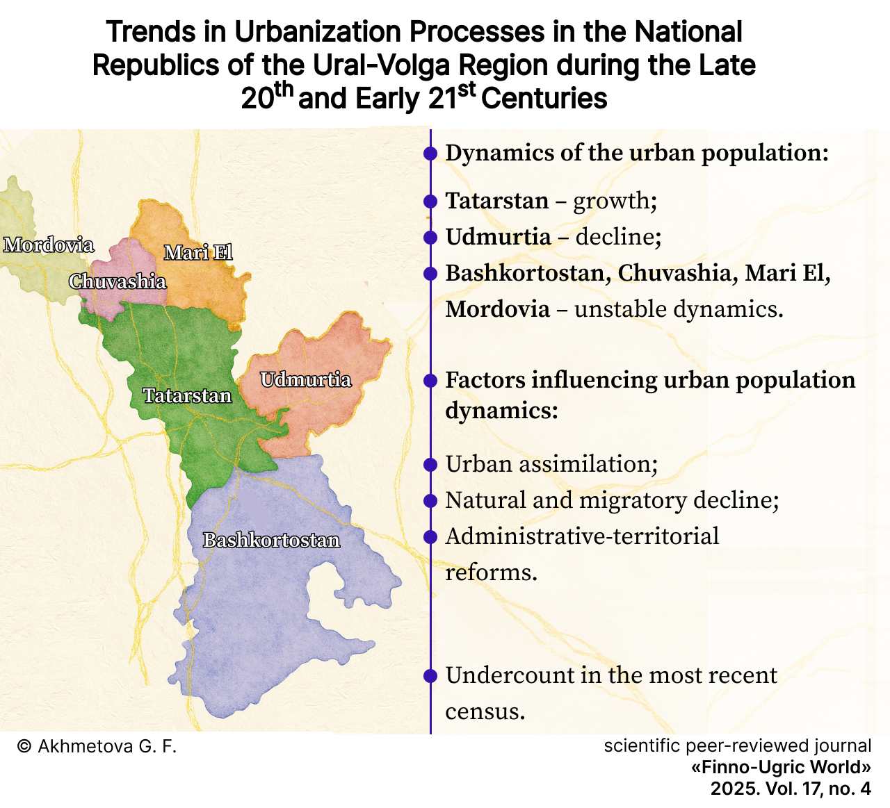 Materials and Methods. Using descriptive statistics, the author analyzes data from the 1989, 2002, 2010, and 2020 Soviet and Russian national censuses, current demographic records, and regional strategic planning documents to identify key trends in agglomeration processes. The analysis focuses on six national republics of the Ural-Volga region: those with indigenous Finno-Ugric (Mari El, Mordovia, Udmurtia) and Turkic populations (Bashkortostan, Tatarstan, Chuvashia).