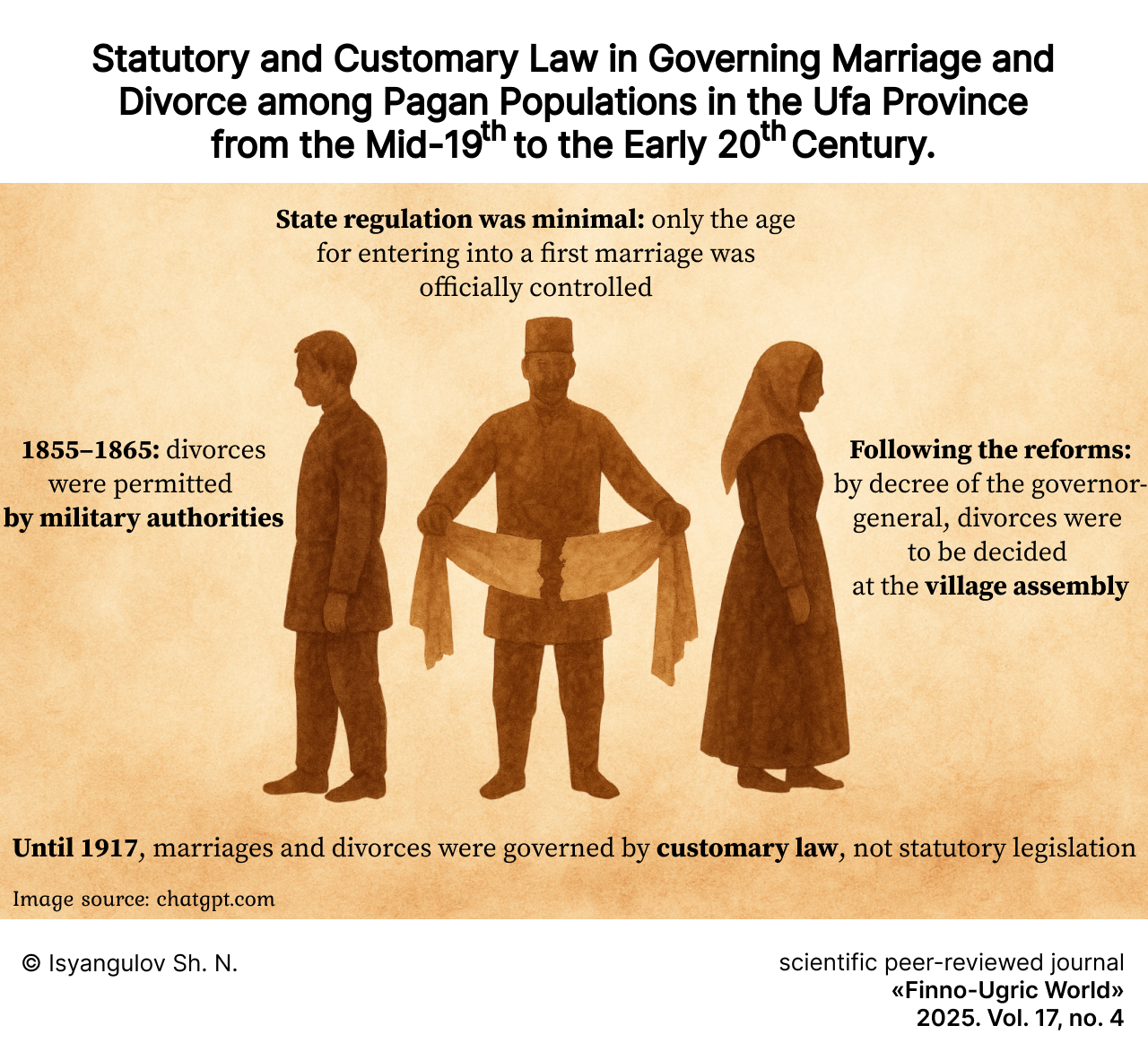 Results and Discussion. The predominant role of customary law norms in regulating marriage and divorce among pagans has been identified. From a legislative standpoint, the marital and family relations of pagans in the Ufa Province during the post-reform period were regulated relatively weakly: only the age for entering a first marriage for young men and women was subject to regulation. The incorporation of pagans into the Bashkir Host in 1855 implied strict control over their family life. In particular, it was the military command during the cantonal period of administration (1855–1865) that granted permission for divorce. This period also marked the beginning of the transition to legal regulation of marital and family relations among the local pagans. During the post-reform period, divorces, by order of the Governor-General, were to be decided at a village assembly. In practice, decisions on divorce, with the consent of both parties, were made by a council of elders; in the absence of such consent, the matter was resolved by the village assembly. In legal terms, until 1917, the marriages and divorces of pagans in the Ufa Province remained unregulated by statute: matrimony and divorce proceedings were primarily governed not by laws, but by local by-laws, which often contradicted official law. State intervention in the sphere of marital and family relations remained minimal.