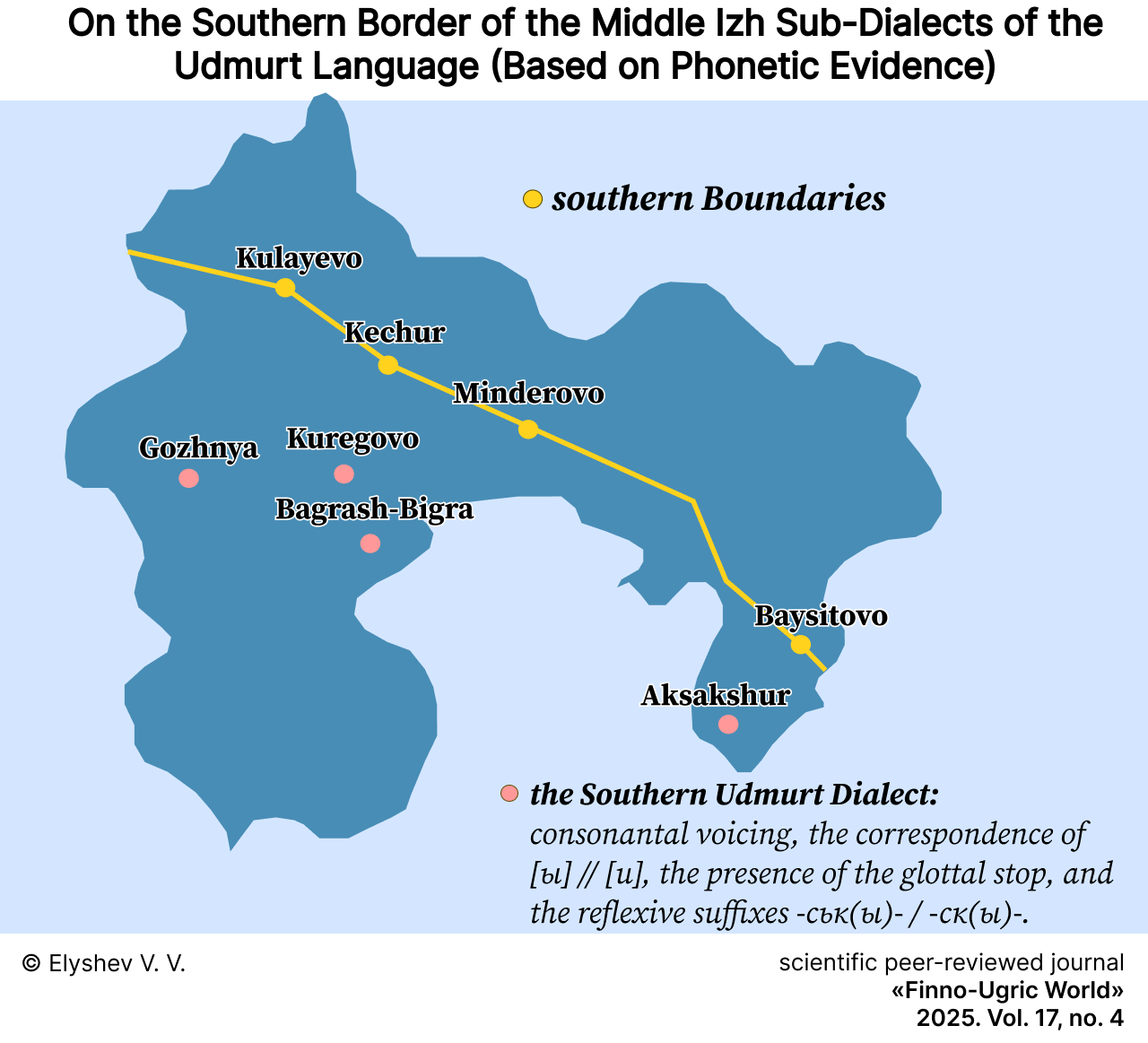 Conclusion. The author presents the first scientifically grounded delineation of the southern boundary of the Middle Izh dialects within Udmurt linguistics. This refinement of their geographical distribution provides a foundation for subsequent comprehensive study. The article constitutes a significant contribution to the field of Udmurt dialectology and, more broadly, to the general theory of Permic linguistics.