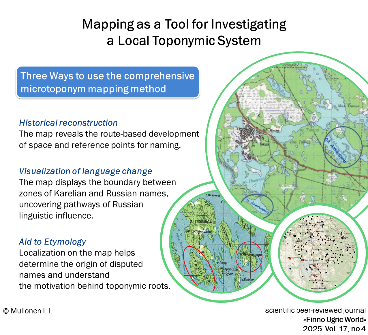 Results and Discussion. This article examines three applications of the method of comprehensive microtoponym mapping. Its contribution to solving core toponymic tasks (problems of nomination) is illustrated by the route-based perspective that mapping reveals. The potential of comprehensive microtoponymic mapping for extracting ethnocultural information is also demonstrated. Through the areal distribution of microtoponyms with Russian and Karelian-derived stems, the primary routes of Russian linguistic influence into the specific local territory of the historical Vyrozero Volost in Zaonezhye are outlined. Localization is often a decisive factor in determining toponymic origin. The article demonstrates its use in establishing the Sami roots of two island toponyms (Oryatsaari and Pellotsaari), which encapsulate the idea of the islands’ position relative to the center of an island archipelago in the Ladoga region. A geographical motivation is proposed for the toponymic stem Akka- (Gen. Akan-) meaning ‘old woman’ or ‘crone’, prompted by a linguistic metaphor.