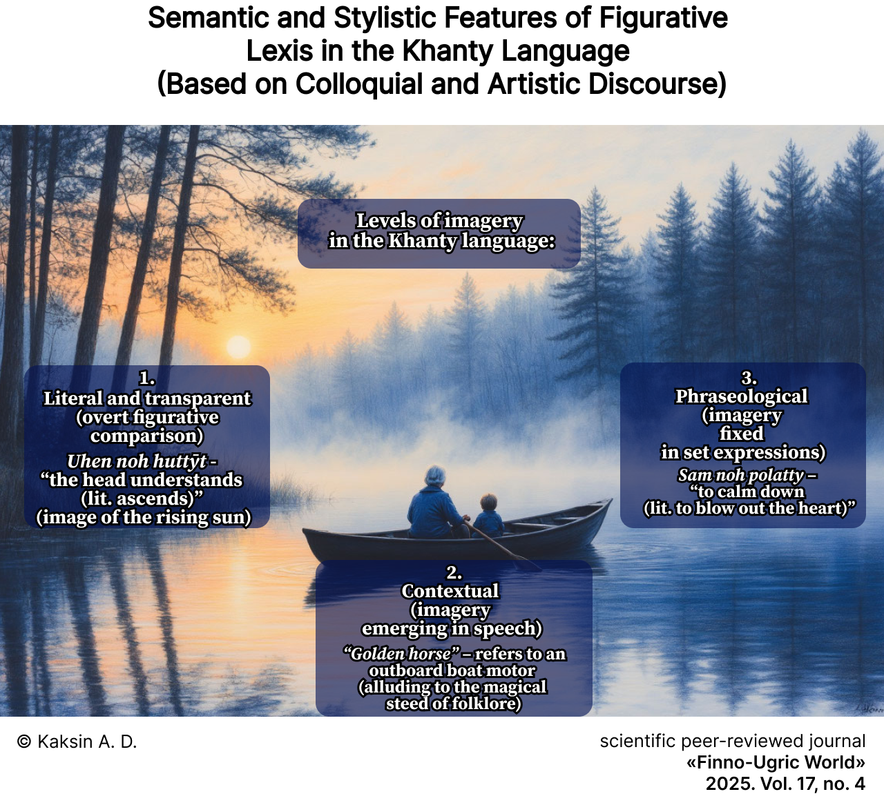 Materials and Methods. The study was conducted using texts in the Kazym dialect of the Khanty language, employing Wolfgang Steinitz’s “Dialektologisches und etymologisches Wörterbuch der Ostjakischen Sprache” (1966–1991). The author’s approach to the topic is based on an understanding of language as a complex, multi-level system, the individual elements of which are studied by linguists using various methods. The essence of the most important method for us lies in the systematization of concepts that describe units of the same nature and that stand in relations of variability to one another. In our case, figurative words and expressions are examined as expressive means, and their distinctive features are identified against the background of epithets, metaphors, and similes. In the course of textual analysis, all expressive means are first identified, followed by those linguistic units whose semantics contain an indication of the location of the source, the original. The semantics of words whose meanings imply the presence of a figurative component are verified using W. Steinitz’s dialectological and etymological dictionary. It is also assumed that many figurative words and expressions of the Khanty language are already recorded in this dictionary.