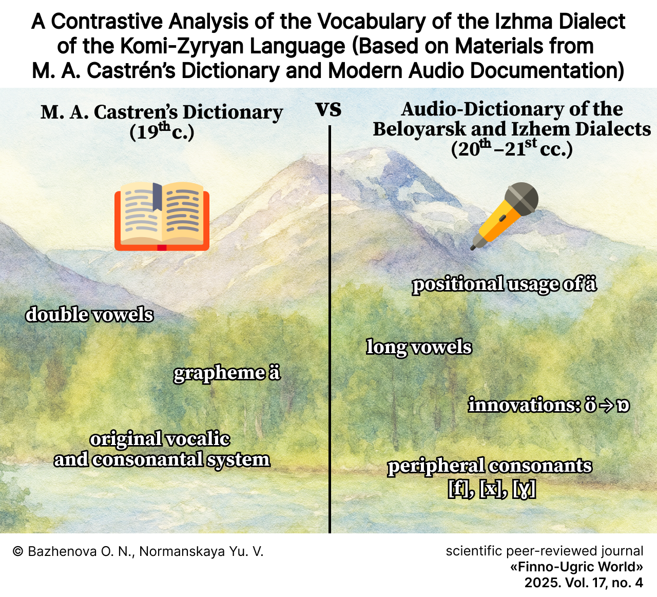 Results and Discussion. A comparison of the data from the experimental-phonetic analysis of the modern Beloyarsk dialect with the materials from M. A. Castren’s dictionary demonstrates the high accuracy of his documentation. Thus, the double vowel graphemes recorded by Castren, although not always corresponding to distinct phonemes in the modern dialect, in most cases correspond to longer vocalic realizations. Of particular interest is the grapheme ä: previously, it could have been considered an irregular notation with no direct parallels either in Proto-Komi or in modern dialects; however, the analysis has shown that its usage followed positional rules. The study also established the approximate timeframe for the development of labial harmony in the Izhem dialect (late 20th – early 21st century). Alongside general trends characteristic of many Komi-Zyrian dialects, specifically Izhem innovations such as ӧ > ɒ have been identified. The modern consonant inventory is supplemented by peripheral sounds [f], [x], [ɣ], found primarily in borrowed vocabulary.