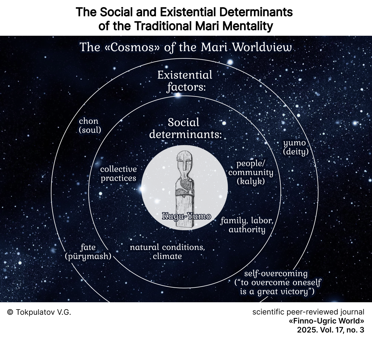 Results and Discussion. Existential determinants, articulated through the concepts of ‘Yumo’ (deity) and ‘chon’ (soul), play a predominant role in the Mari mentality. Social conditions are mediated through spiritual practices, and the Mari worldview is characterized by properties of fractality and heterarchy, which indicates a recurrence of cultural patterns across different levels of being.