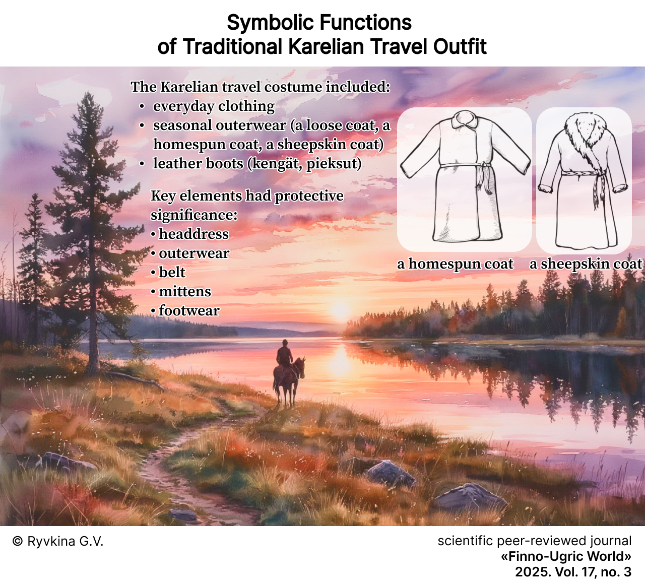 Results and Discussion. As a travel outfit, the Karelians used everyday clothing, supplementing it with specialized types of outerwear. Analysis of the sign-symbolic functions of the costume identified the mandatory elements of a traveler’s clothing: a headdress, outerwear, a belt, mittens, and footwear. These components were endowed with symbolic meaning: they prevented the influence of hostile forces on the traveler, established a boundary between the person and the “foreign” world, creating a safe zone around the traveler in a potentially dangerous road environment, and served as a person’s road marker.