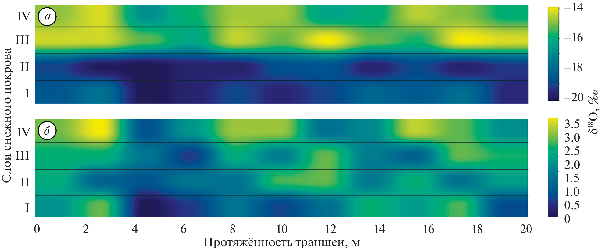 The isotopic composition (δ18O values) of snow layers, constructing snow cover to the time of reaching maximum snow water equivalent (SWE), was compared with the isotopic content of snow precipitated over the whole the winter season 2018/19 on the territory of the Meteorological Observatory of the Lomonosov Moscow State University (Moscow, Russia). Snow-sampling was carried out in a trench 20 m long simultaneously with detailed measurements of spatial variability of the structural characteristics of snow depth. Sampling was conducted for each precipitation event over the winter season, with the amount of precipitation also documented. It was found that the spatially-distributed enrichment with heavy oxygen isotopes along the trench fell within the range of 0–3.5‰, with average values for the four main formed snow layers changing from 1.3 to 2.5‰. The enrichment was not much dependent on the age of snow layer in the snowpack, and it was even more pronounced in the upper layers. This suggests that the post-precipitated change in the isotopic composition of snow cover for the conditions of the investigated site mainly took place when the snow was exposed to the atmosphere (due to sublimation and evaporation), while the processes of dry and wet metamorphism were either less important or even led to leveling the effects of isotopic fractionation. A positive correlation was found between the isotope composition of snow and the spatially varying snow density in each layer. This is most probably related to involvement of wind influence into the snow accumulation resulting in more dense snow. The spatial variability of the isotope composition of snow in each layer was smaller than changes in snow density and snow water equivalent.