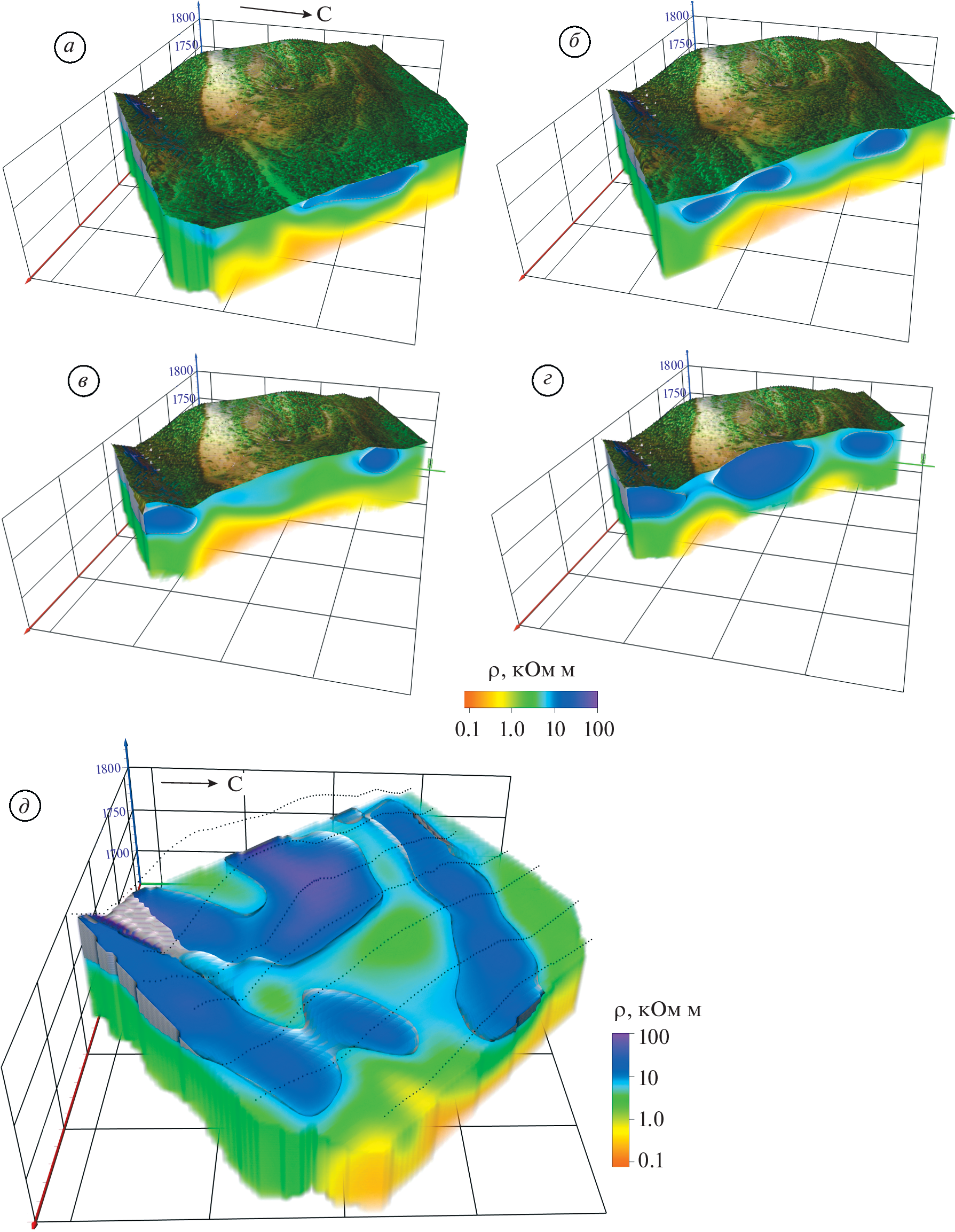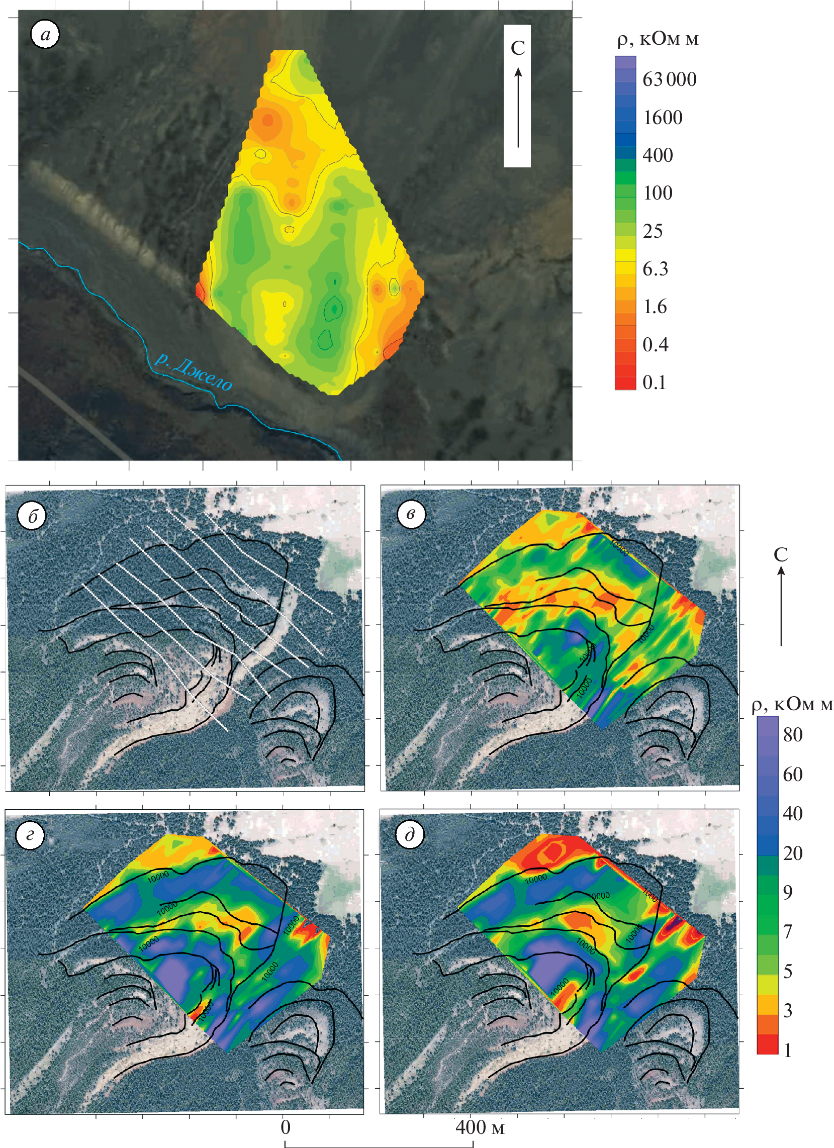 Geophysical observations of the structure of glacial-permafrost rock formations (hereinafter referred to as GPRF), common in the Central Altai in the valleys of the Chuya, Dzhelo, Elangash and Akkol rivers, were carried out by way of electrical resistivity tomography using the multi-electrode electro-prospecting station “Skala-48”. The main objective of the research was to identify the features of the internal structure of GPRF basing on the data of electrical sounding and aerial photography. The application of the geophysical method made it possible to localize rock-ice cores within the GPRF. Analysis of the geoelectrical cross-sections allowed finding that the rock-ice cores were characterized by high values of specific electrical resistance (SER) – from 10 to 100 kOhm ⋅ m and more. The depths of occurrence of rock-ice material on the geoelectrical sections varied from 2 to 10 m, on the average. Using the data of the aerial photography carried out above the studied areas, three-dimensional geoelectric models and maps of the distribution of SER were built for different depths. When analyzing the three-dimensional model of the GPRF, it is clearly noticeable that the features of the nature of the SER distribution reflects the inhomogeneous distribution of ice within the rock-ice core of the GPRF. As a result of our studies performed by the method of electrical tomography and interpretation of a three-dimensional geoelectric model, it was estimated that thicknesses of the rock-ice material varied from 7 to 32 m, thawing niches were revealed and localized, and the potential volume of the rock-ice core was determined. Thus, the above mentioned geophysical and geomorphological studies in that the features of the internal structure of GPRF in key areas have been established. For each GPRF, the thicknesses, resistivity, and depth of occurrence of rock-ice cores were determined, and the dependence of the morphological structure of the GPRF surface on internal structure of them was analyzed. A preliminary assessment of water reserves in individual GPRF had also been made.