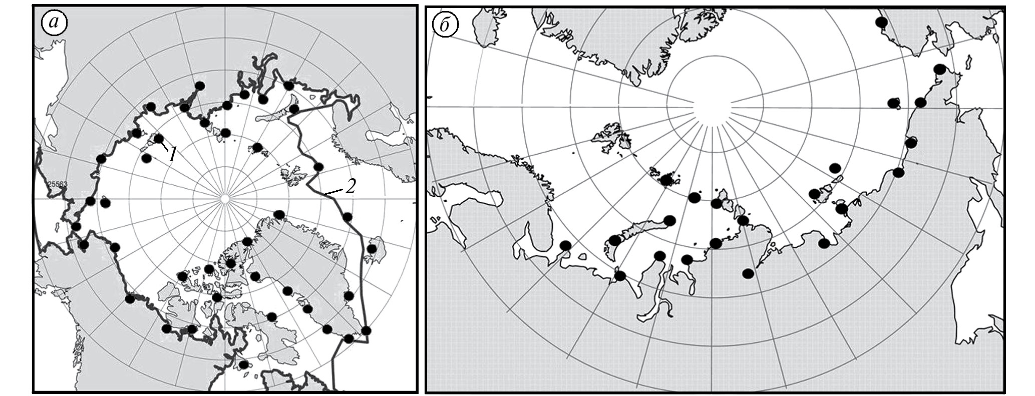 Fig. 1. Meteorological stations on the islands and coast of the Arctic Ocean and the Arctic seas of the Northern Sea Route: in the Arctic Ocean (а); in the Arctic seas of the Northern Sea Route (б). The dots are stations; blue line — the boundary of the largest winter extent of sea ice in the Arctic.