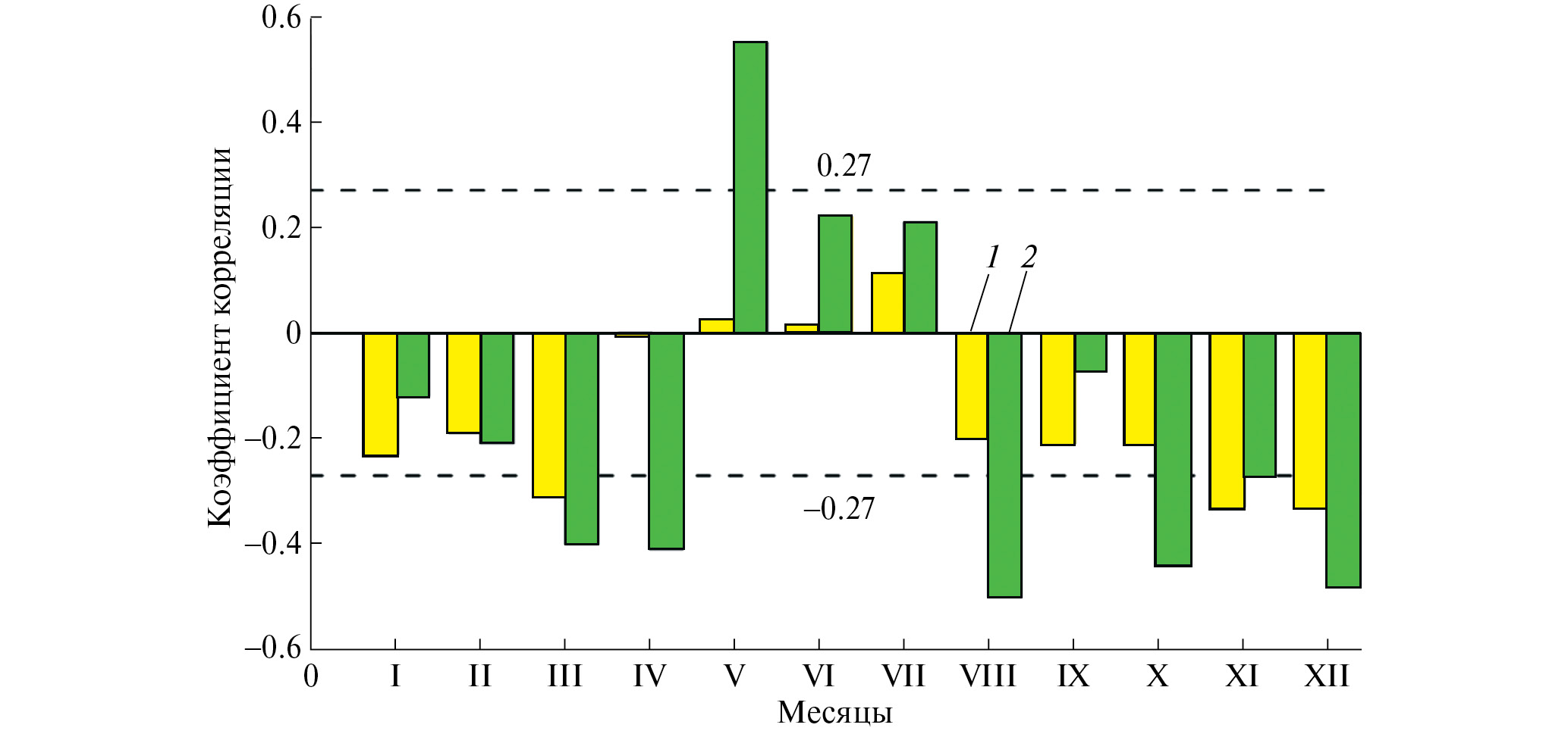 Рис. 3. Коэффициенты корреляции между разностями от месяца к месяцу ледовитости и температуры воздуха в Северном Ледовитом океане и морях Северного морского пути: 1 — Северный Ледовитый океан; 2 — моря Северного морского пути.