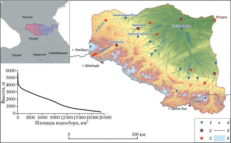 Fig. 1. The Terek River basin to the Mozdok outlet: 1 — hydrological gauges; 2 — hydrological gauges and meteorological stations; 3 — meteorological stations; 4 — mountain peaks; 5 — state border of the Russian Federation; 6 — glaciers (RGI 6.0)