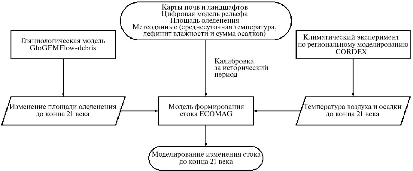 Согласно данной схеме в качестве входных данных в модели ECOMAG использованы сеточные данные о приземной температуре и сумме атмосферных осадков суточного разрешения с пространственным разрешением данных 1×1 км. Исторический период включает суточные данные об осадках и температуре воздуха за 1977—2005 гг., прогностический — аналогичные данные за 2006—2099 гг.