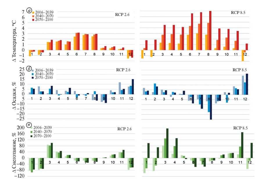 Рис. 5. Прогнозируемые аномалии среднемесячных температур воздуха (а), сумм осадков (б) и снеготаяния (в) на территории бассейна р. Терек для двух различных сценариев (RCP2.6 и RCP8.5) в пределах исследуемого водосбора