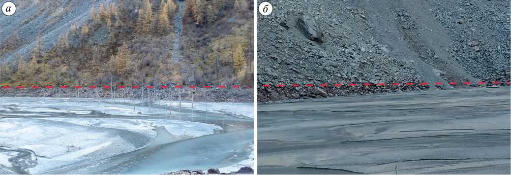 Fig. 2. High-water elevation of Lake Maashei: lack of vegetation (a) and color of boulders (б). Photos by Rasputina V. A., September 2022