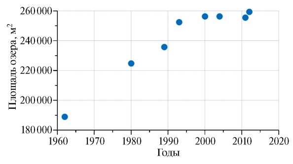 График на рис. 4, б отражает ускорение таяния ледника, что, в свою очередь, привело к более интенсивному росту площади озера и, соответственно, увеличению его водной массы.