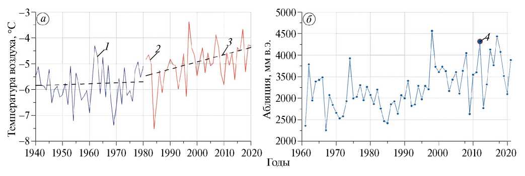 Рис. 4. Ход среднегодовой температуры воздуха по данным метеостанции Кара-Тюрек (а); изменение величины средней абляции на леднике Большой Маашей за летний сезон (б): 1 — ход среднегодовой температуры воздуха до 1980 г.; 2 — ход температуры воздуха после 1980 г.; 3 — тренды температуры воздуха; 4 — величина абляции на леднике Большой Маашей в 2012 г.