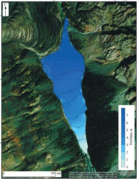Морфометрические характеристики озёрной котловины. На основе выполненной тахеометрической съёмки была восстановлена батиметрическая схема оз. Маашей до прорыва и получены его морфометрические характеристики (рис. 5). Отметим, что горизонт высоких вод был отчётливо виден на бортах котловины: по отсутствию растительности (рис. 2, a) и окраске камней (рис. 2, б) в местах, которые ранее были под водой.