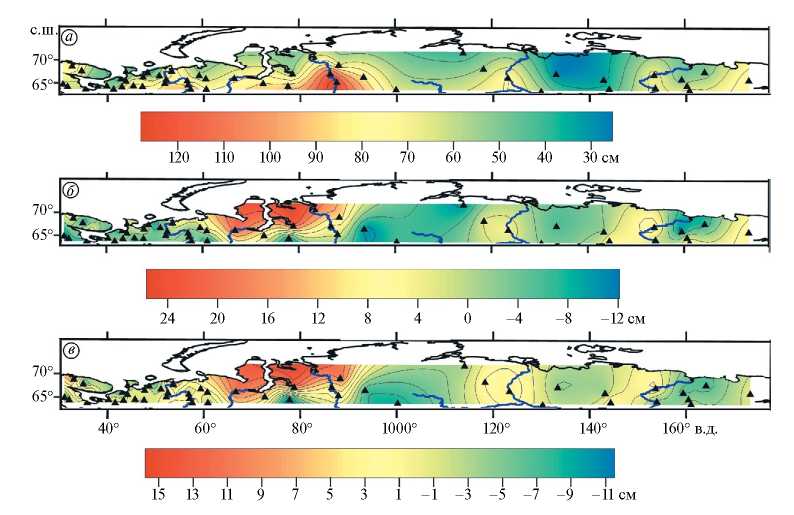 Цифры, приведённые в работе (Доклад, 2023), показывают снижение коэффициентов линейного тренда МВСП за период 1976–2022 гг. на западе и в центре арктической зоны ЕТР, севере Восточной Сибири и Чукотке (исключая её тихоокеанское побережье) на 1.5–2.0 см/10лет и рост линейного тренда МВСП на 1.5–2.0 см/10лет на Кольском полуострове, северо-востоке ЕТР и севере Западной Сибири.