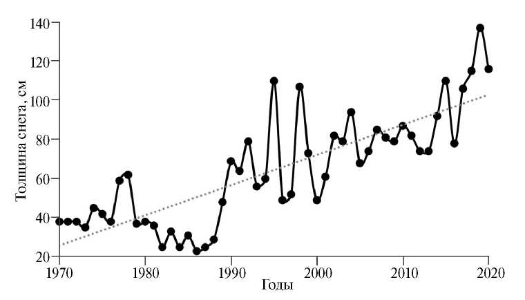 При среднем значении высоты снежного покрова 82 см за период 1991–2020 гг. среднее квадратическое отклонение составляет 22 см. Тренд высоты снежного покрова за период 1970–2020 гг. составляет y = 1.5633x – 3054.4; где коэффициент достоверности R² = 0.6469. Статистическая значимость коэффициентов этих трендов подтверждается расчётом t-критерия Стьюдента при уровне значимости 0.05. Тренд за период 1991–2020 гг. практически совпадает с трендом за 1970–2020 гг. Тренд за период 1970–1990 гг. статистически незначим.