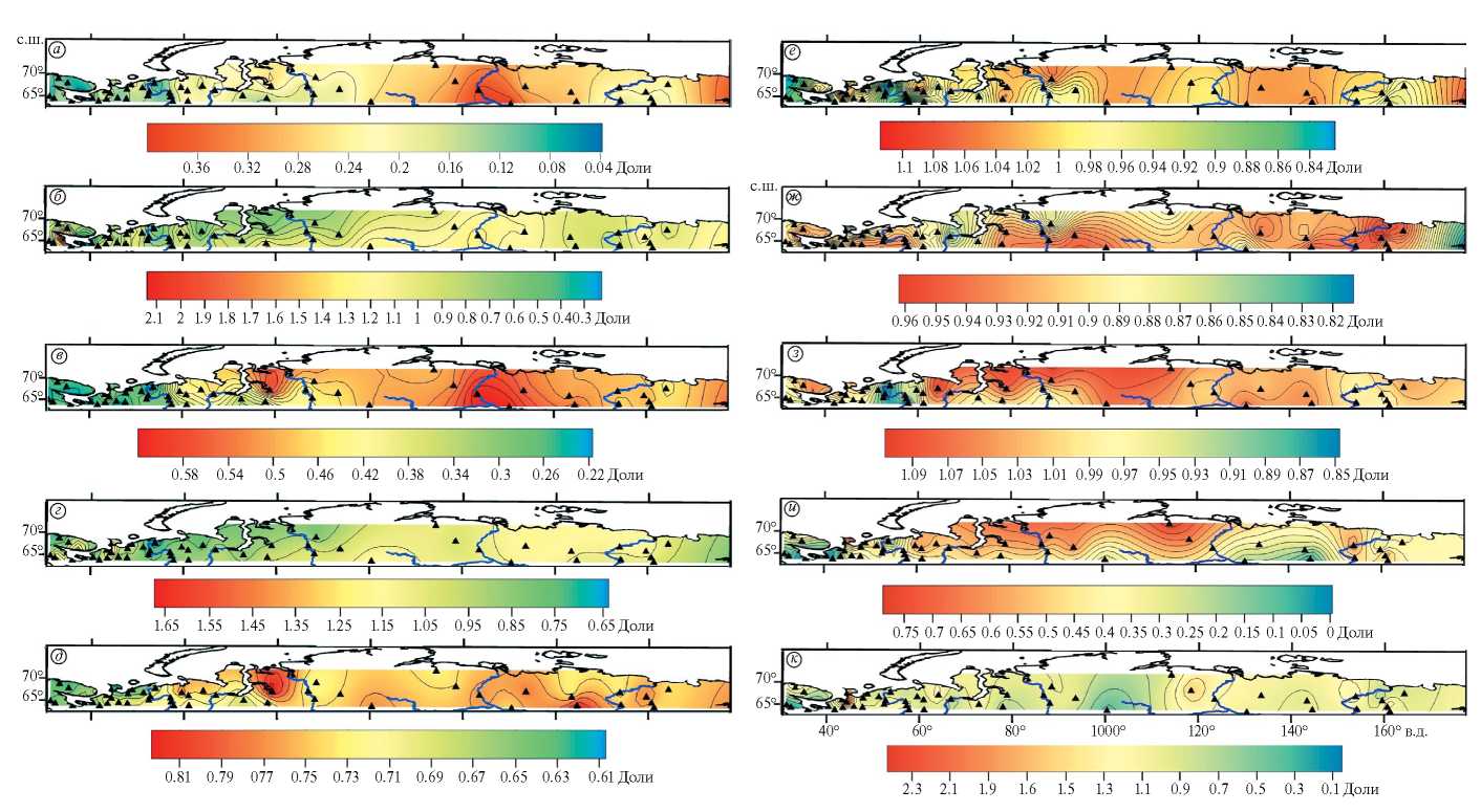 Рис. 4. Динамика снегонакопления в Арктике за период 1991–2020 гг. (а, в, д, ж, и) и её отношение к динамике снегонакопления (г) за период 1966–1990 гг. (б, г, е, з, к) за месяцы: а, б – октябрь; в, г – ноябрь; д, е – январь; ж, з – март; и, к – май