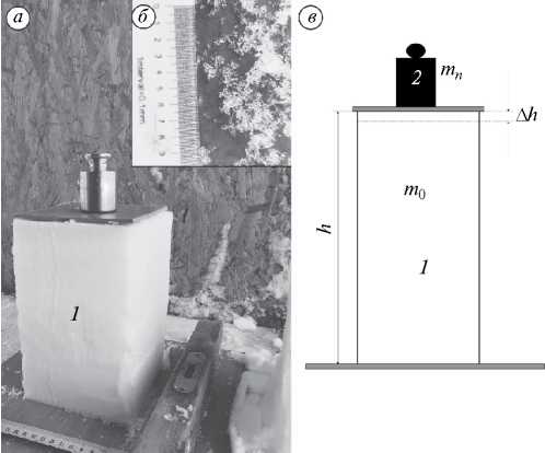 Рис. 1. Испытание образца мелкозернистого снега для измерения компрессионной вязкости: а – фото испытания образца снега; б – макросъёмка кристаллов; в – схема эксперимента; 1 – образец; 2 – нагрузка; 3 – мерная планка