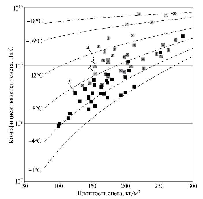 Рис. 3. Экспериментальные значения коэффициента вязкости мелкозернистого снега в зависимости от плотности и температуры: 1 – от –1 до –4 °С; 2 – от –4 до –8 °С; 3 – от –8 до –18 °С; 4 – формула (3)