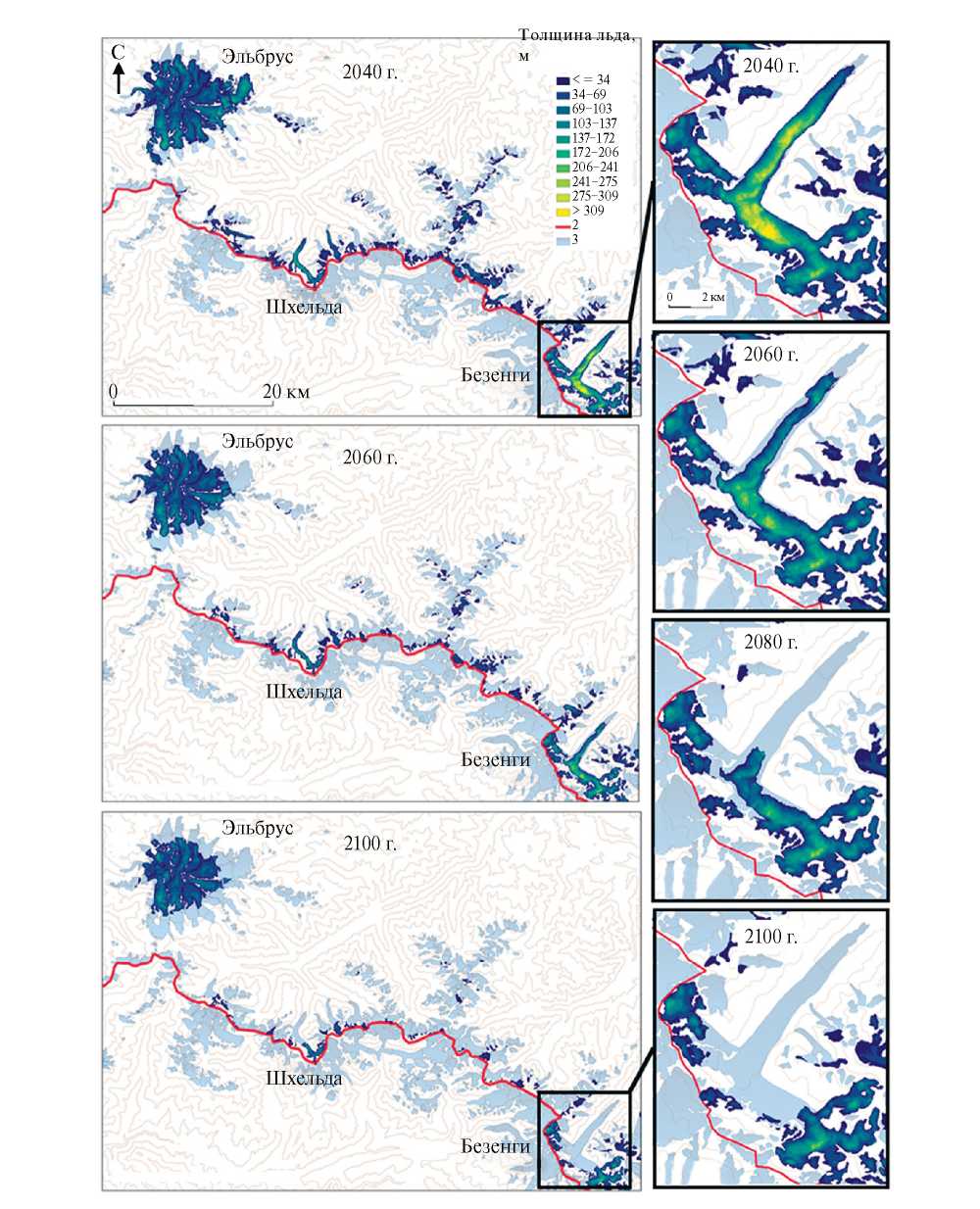 Модель, использованная в данной работе, вообще говоря, не предназначена для детальной реконструкции отдельных ледников, однако провести некоторые качественные сравнения между характером эволюции некоторых ледников в разных климатических сценариях всё же возможно. Например, ледник Шхельда к 2100 г. отступит на 500 м выше в сценарии SSP5–8.5, чем в сценарии SSP1–2.6. Ледник Джанкуат к 2060 г. практически полностью исчезнет в сценарии SSP5–8.5, в то время как в сценарии SSP1-2.6 небольшой фрагмент ледника всё же сохранится. Большие разветвлённые ледники разделятся на несколько маленьких. Например, ледник Безенги, согласно прогностическим расчётам, рано или поздно (в зависимости от климатического сценария) разделится на несколько частей (см. рис. 1): часть ледника, движущегося со стороны перевала Цаннер, отделится до 2030 г., со стороны горы Гивтола – в 2050-х годах, со стороны горы Джангитау – в 2030-х годах. При этом во второй половине века на высоте около 2900 м над ур. моря в случае сильного потепления образуется область льда, которая полностью отделится от основной области аккумуляции в 2060-х годах и сравнительно быстро стает, после чего ледник отступит выше 3000 м над ур. моря. Для более точного прогноза требуется использовать трёхмерную гляциологическую модель.